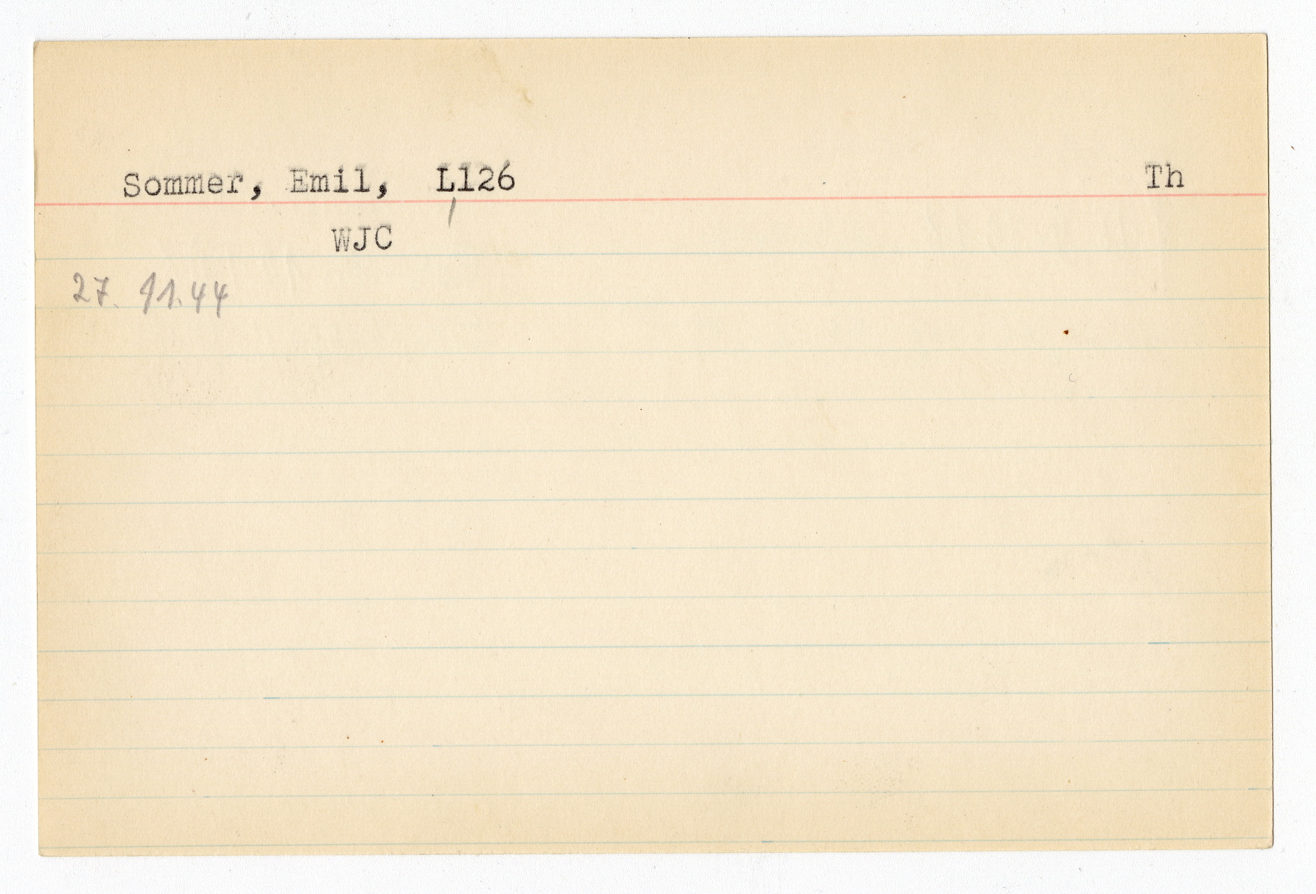 Ett skrivkort med patientuppgifter gällande Elsa Basch. På baksidan uppgifter om matpaket till Emil Sommer i Theresienstadt.