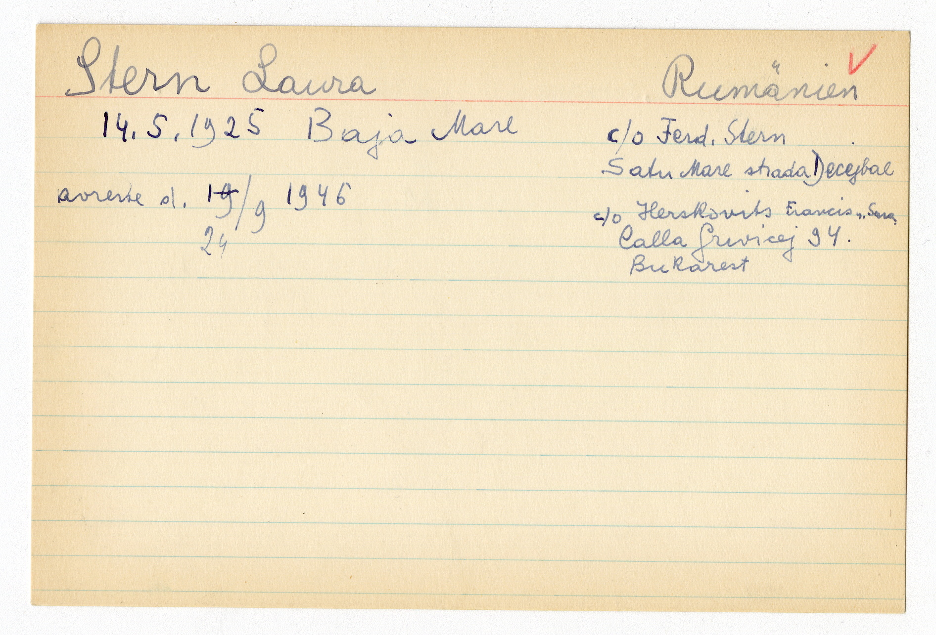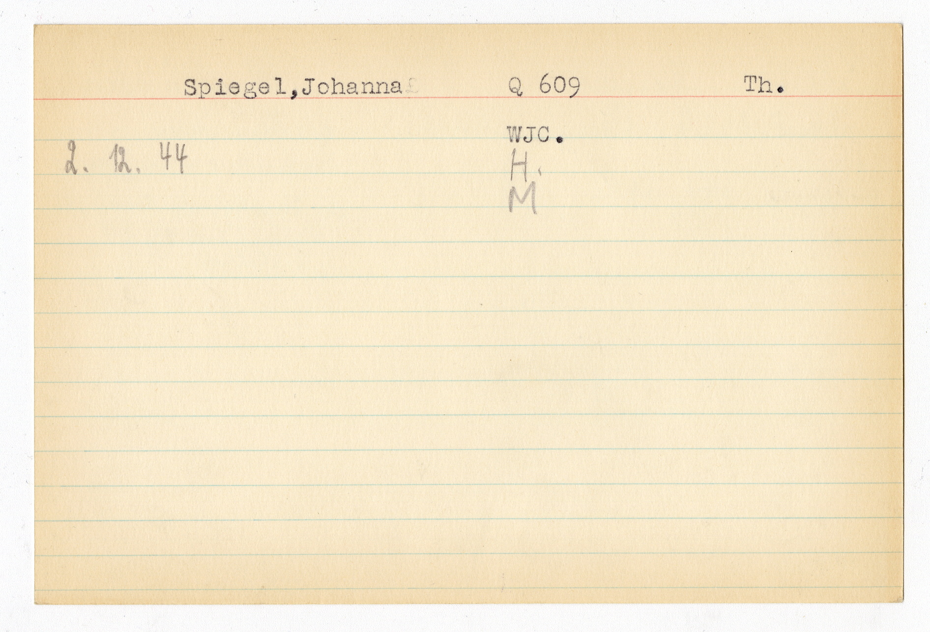 Ett skrivkort med patientuppgifter gällande Laura Stern. På baksidan uppgifter om matpaket till Johanna Spiegel i Theresienstadt.