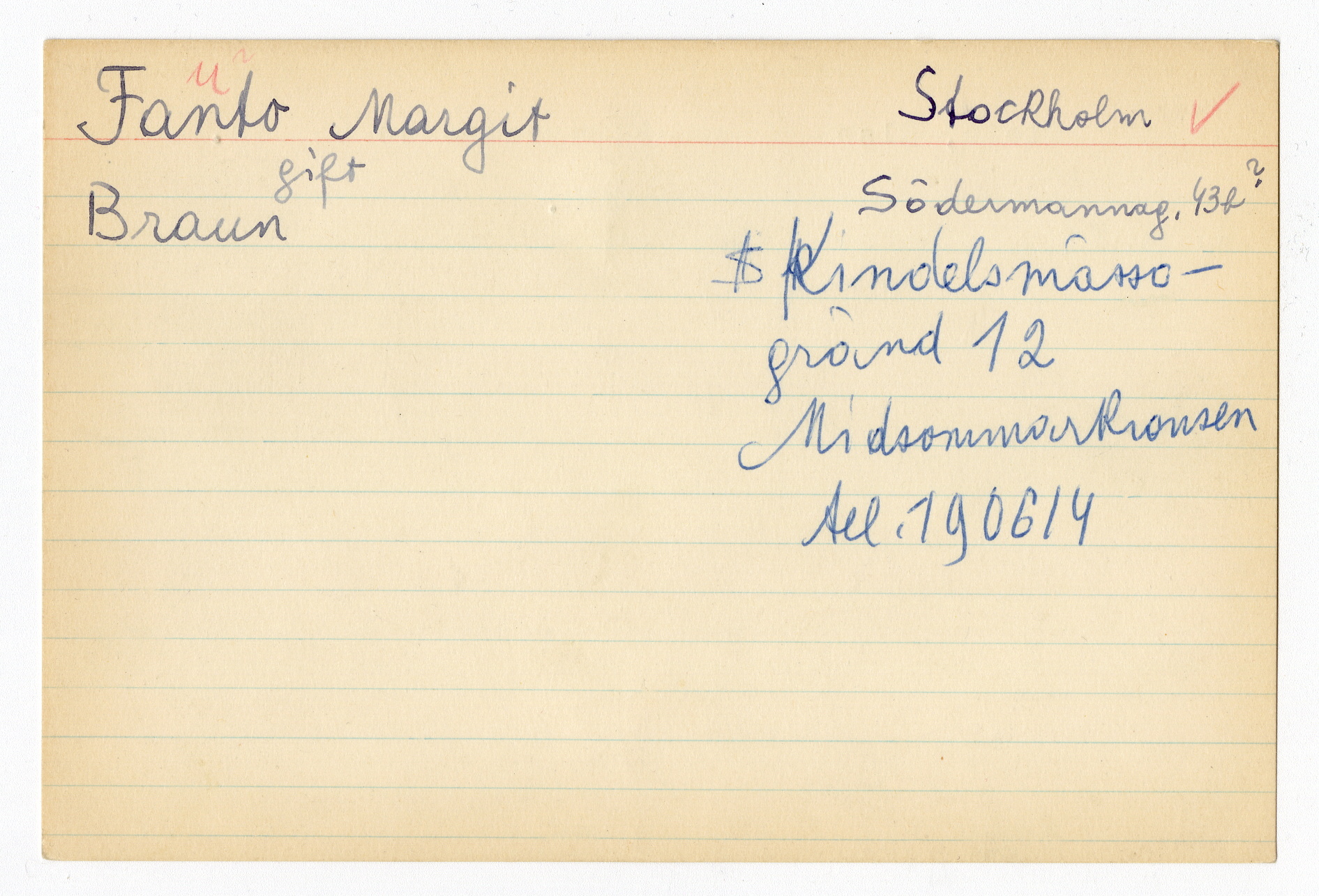 Ett skrivkort med patientuppgifter gällande Margit Fanto. På baksidan uppgifter om matpaket till Else Stein i Theresienstadt.
