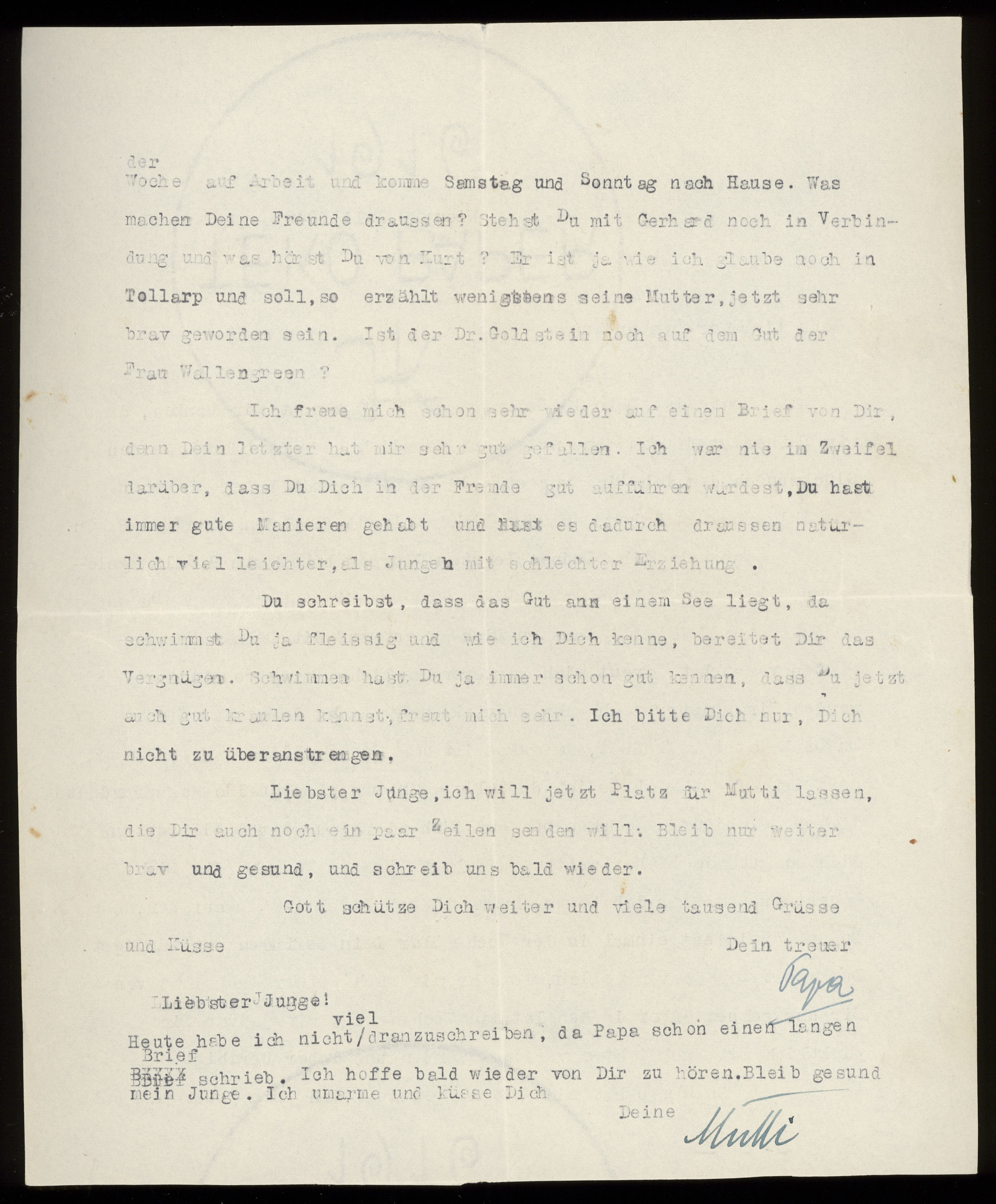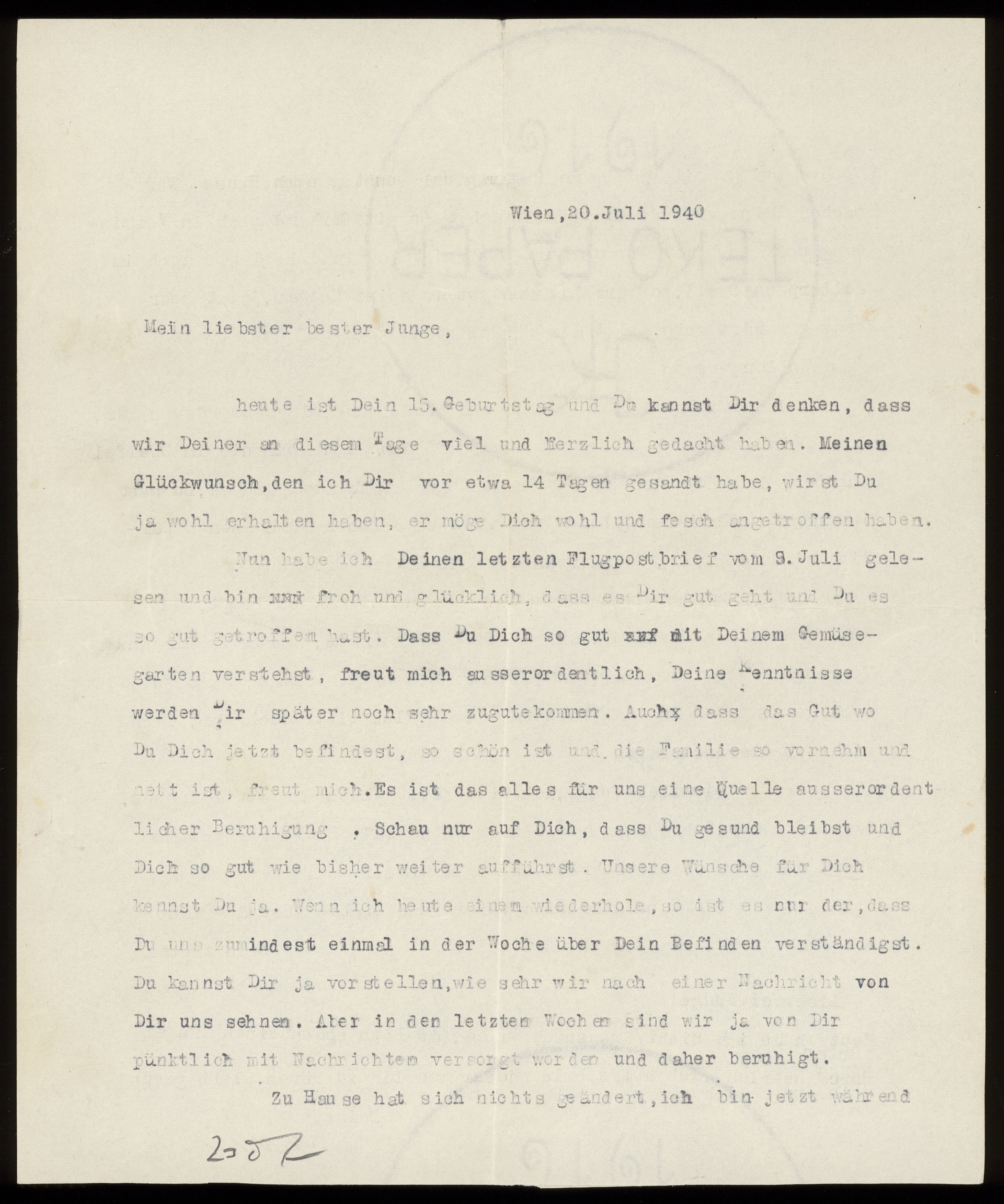 Maskinskrivet brev till Otto Ullman från föräldrarna Josef och Elise Ullmann daterat 20 juli 1940 Wien.