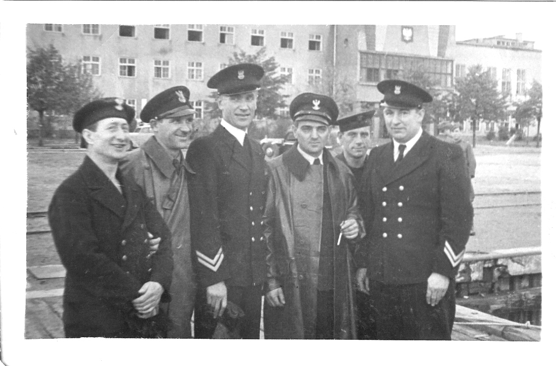 Gruppfotografi av marinsoldater i Gdynia, oktober 1945. Fotografiet taget efter att de kunnat lämna Sverige och återvända till Polen. Sannolikt fotograferat framför the Naval Academy in Gdynia. Józef Pastuszuk är tredje från vänster i bild.