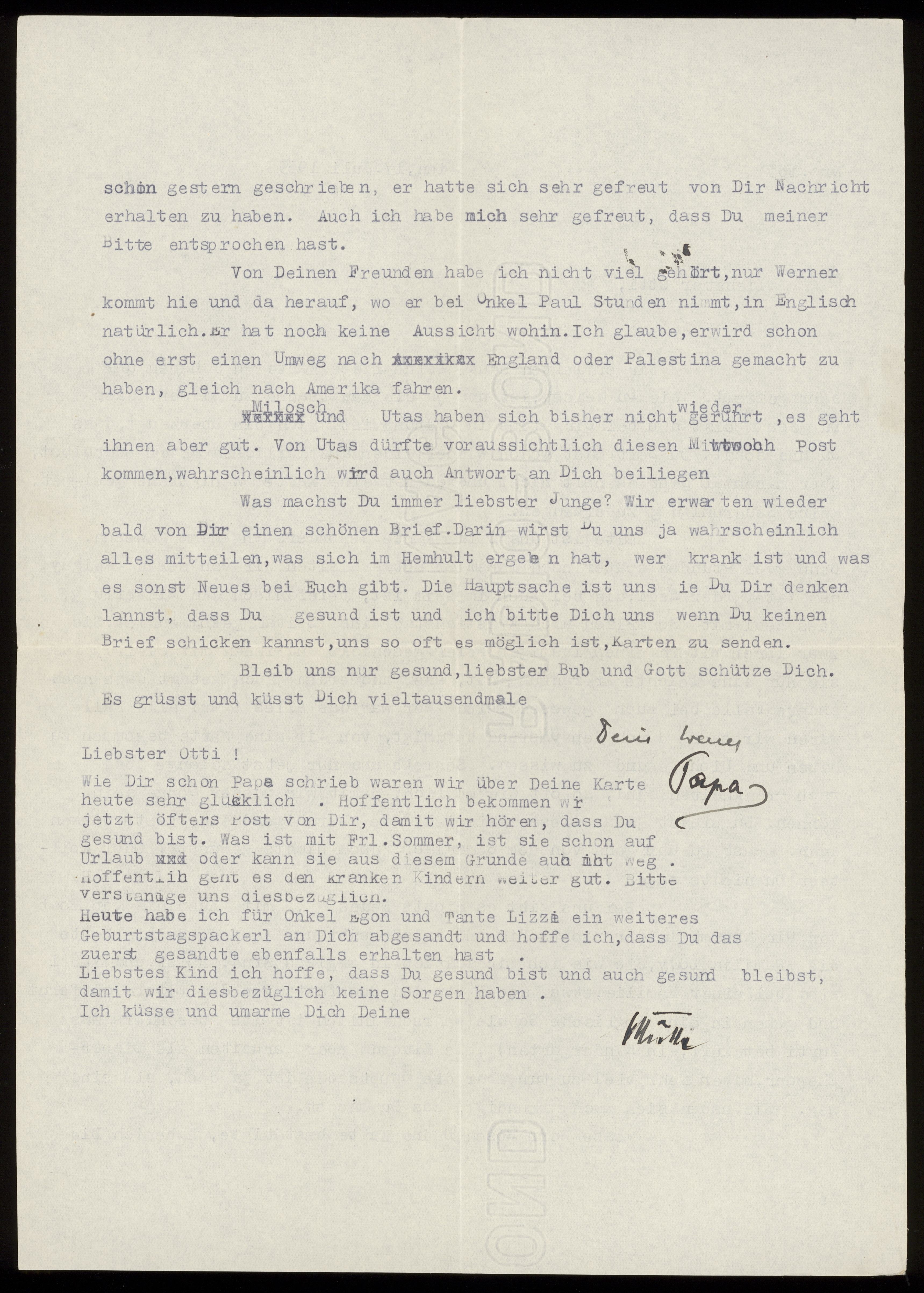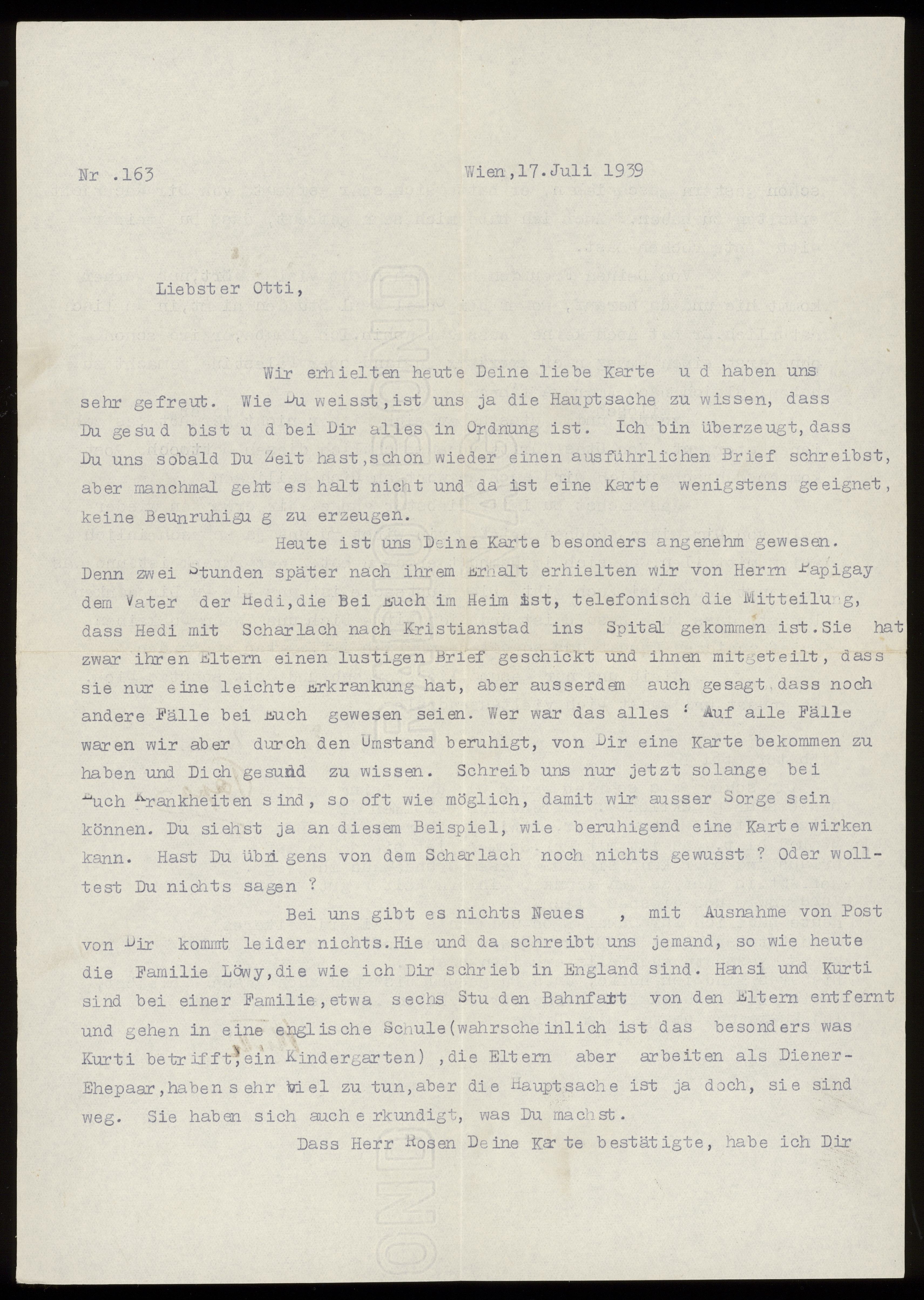Maskinskrivet brev till Otto Ullman från föräldrarna Josef och Elise Ullmann daterat 17 juli 1939 Wien.