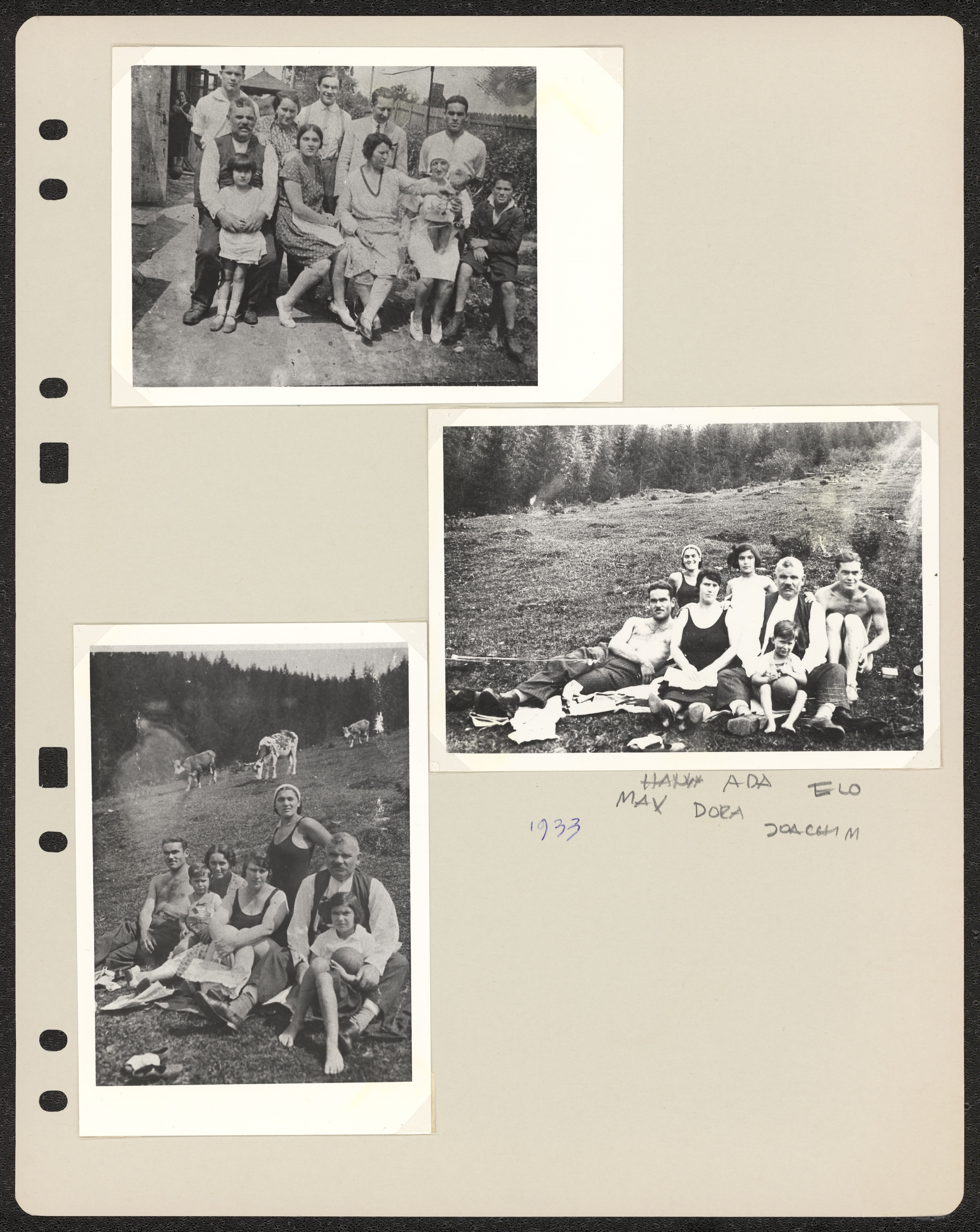 Albumsida från Ada Beckers fotopärm. På albumsidans framsida sitter tre fotografier föreställande Ada Beckers familj1933, på baksidan tre fotografier.