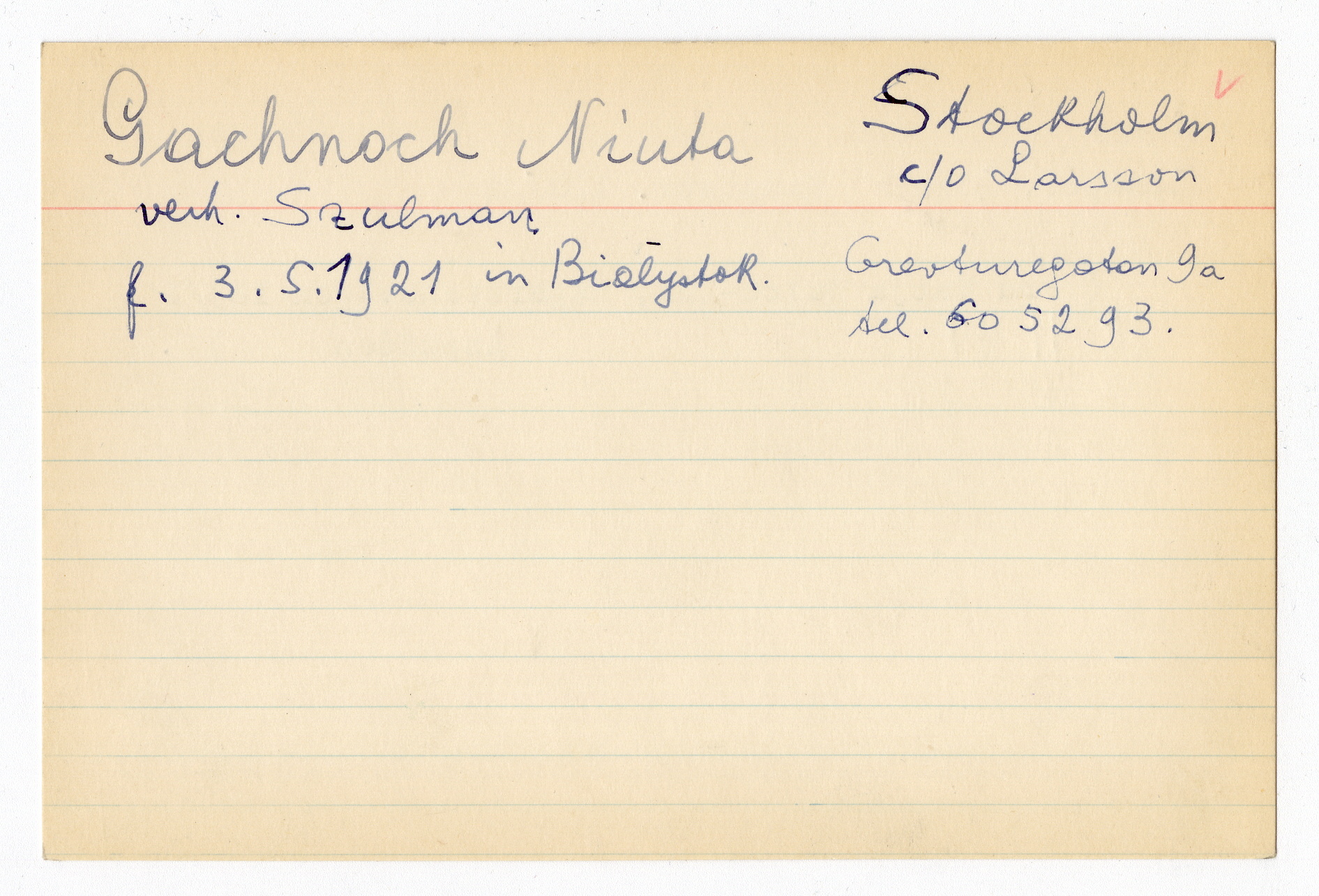 Ett skrivkort med patientuppgifter gällande Niuta Gachnoch. På baksidan uppgifter om matpaket till Else Schaper i Theresienstadt.