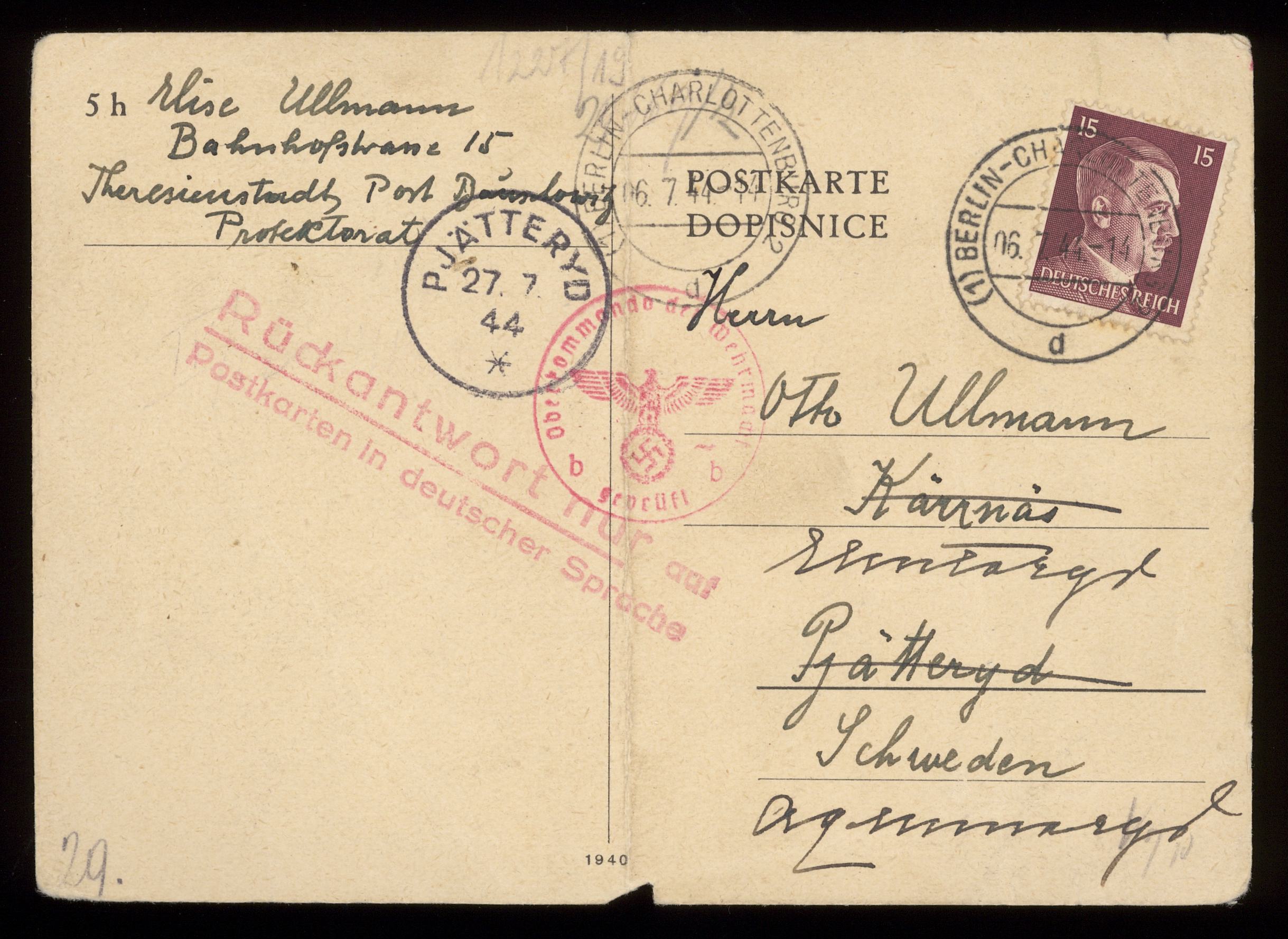 Brev till Otto Ullman från föräldrarna Josef och Elise Ullmann daterat 2 november 1943 Theresienstadt.