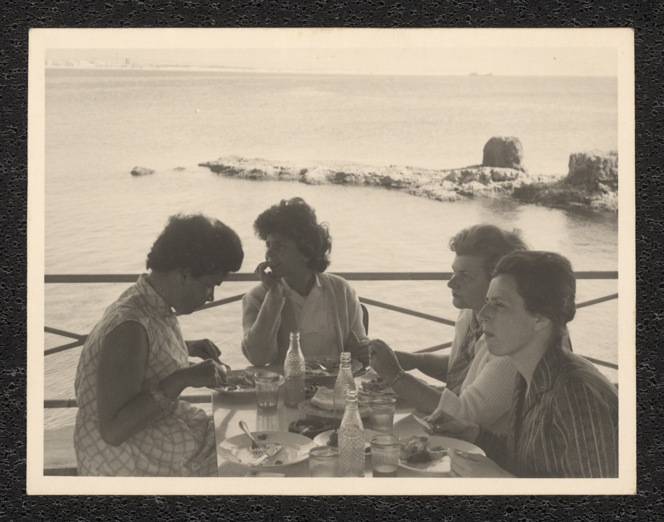 Vid ett bord på en strandsservering sitter Ada Becker tillsammans med tre Personer.