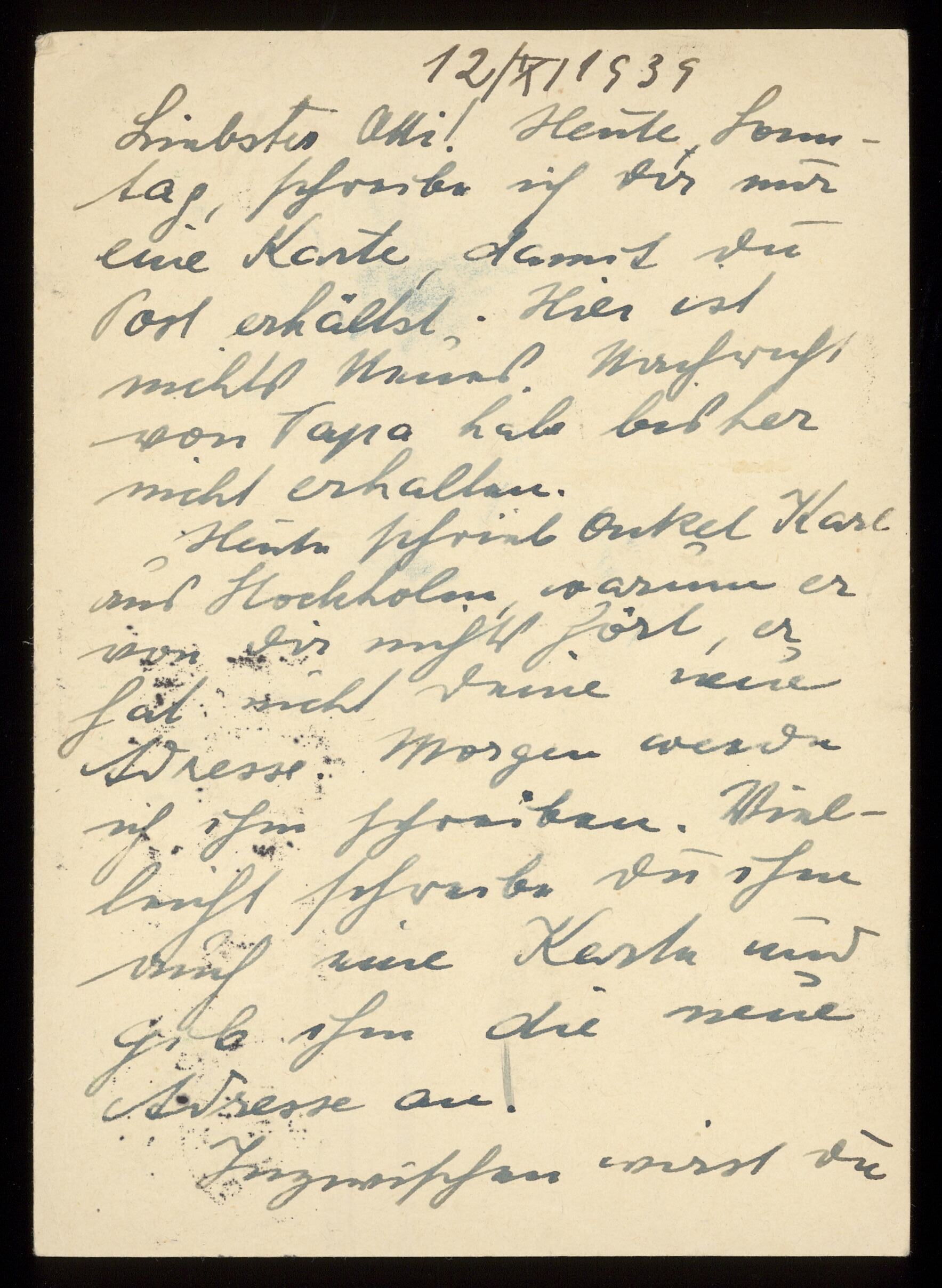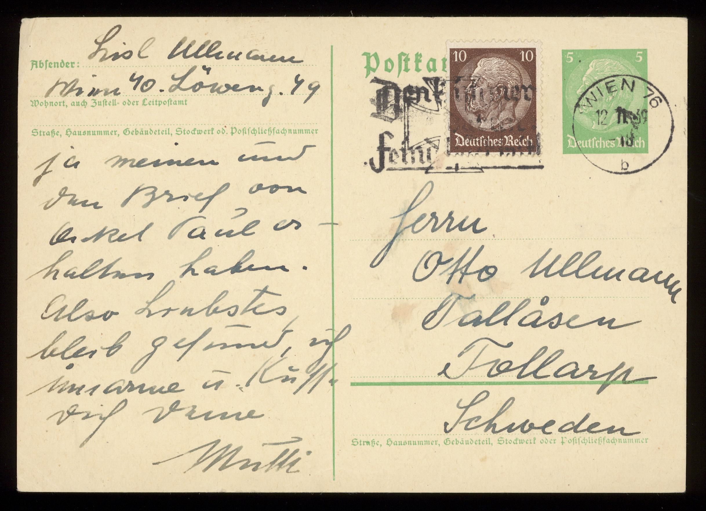 Brev till Otto Ullman från föräldrarna Josef och Elise Ullmann daterat 12 november 1939 Wien.