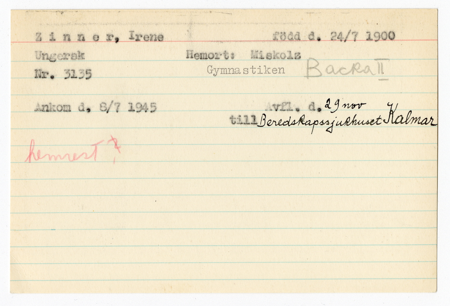 Registerkort Irene Zinner