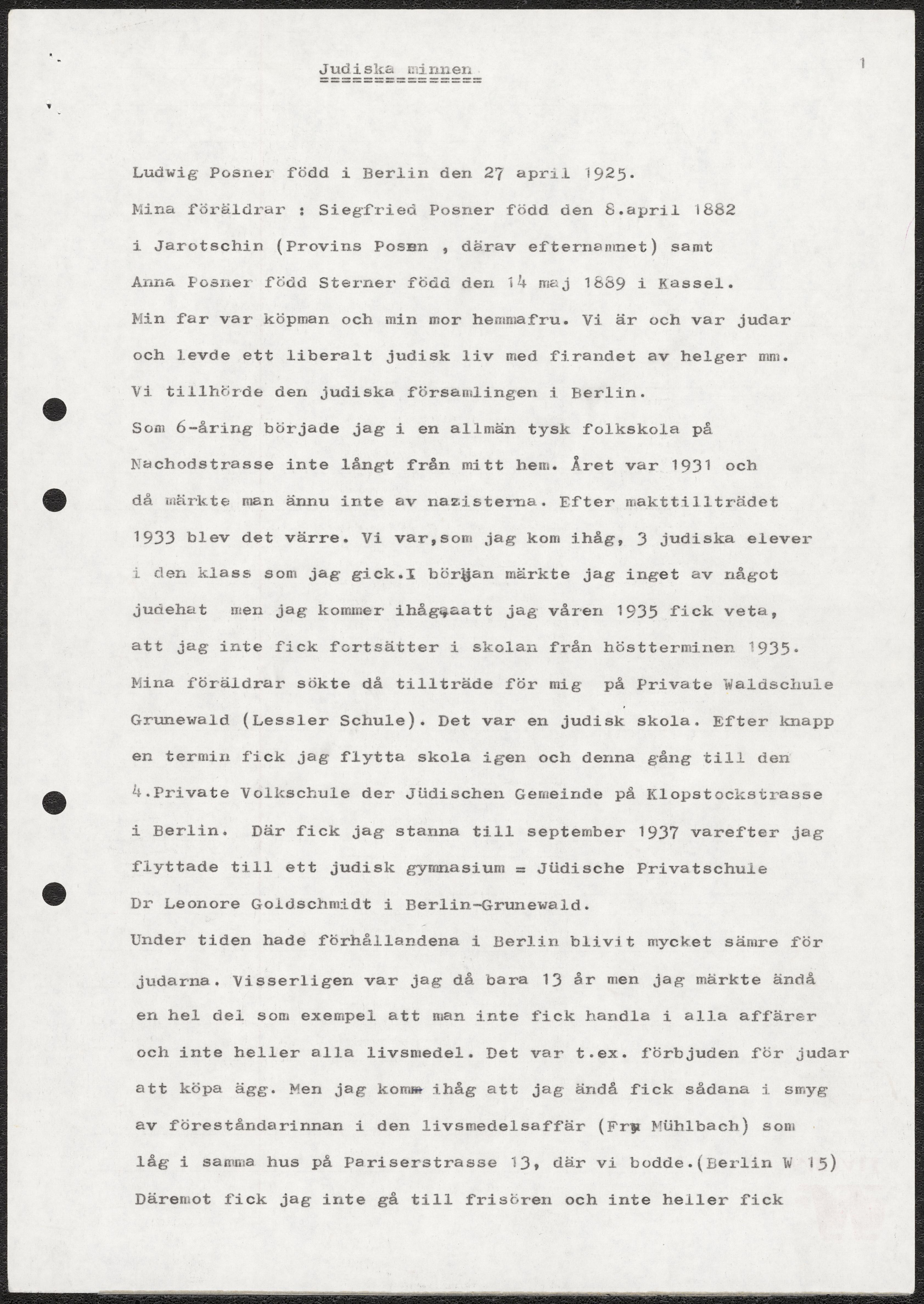 Nedskriven levnadsberättelse av och om Ludwig Posner, kallad Judiska minnen.