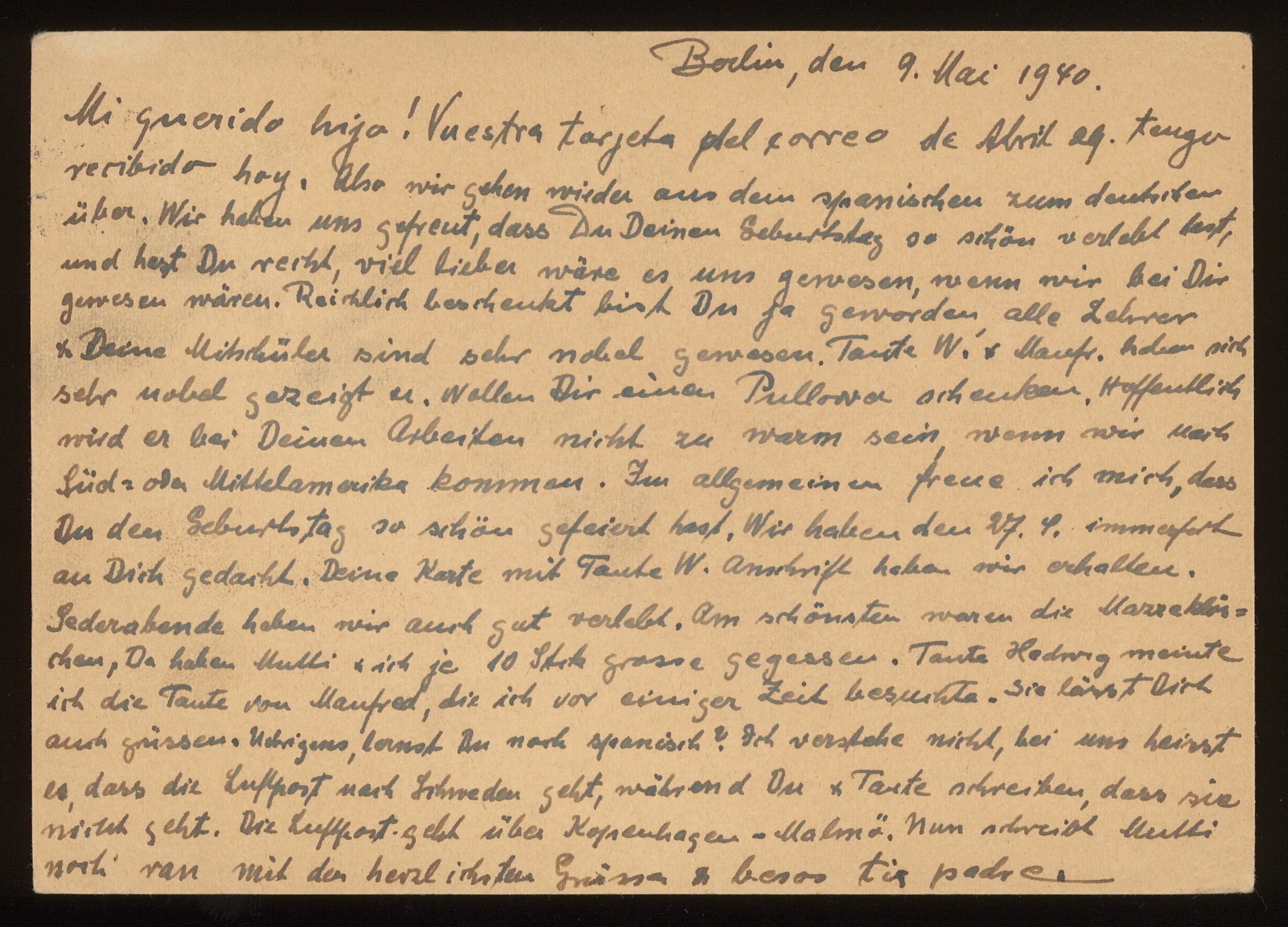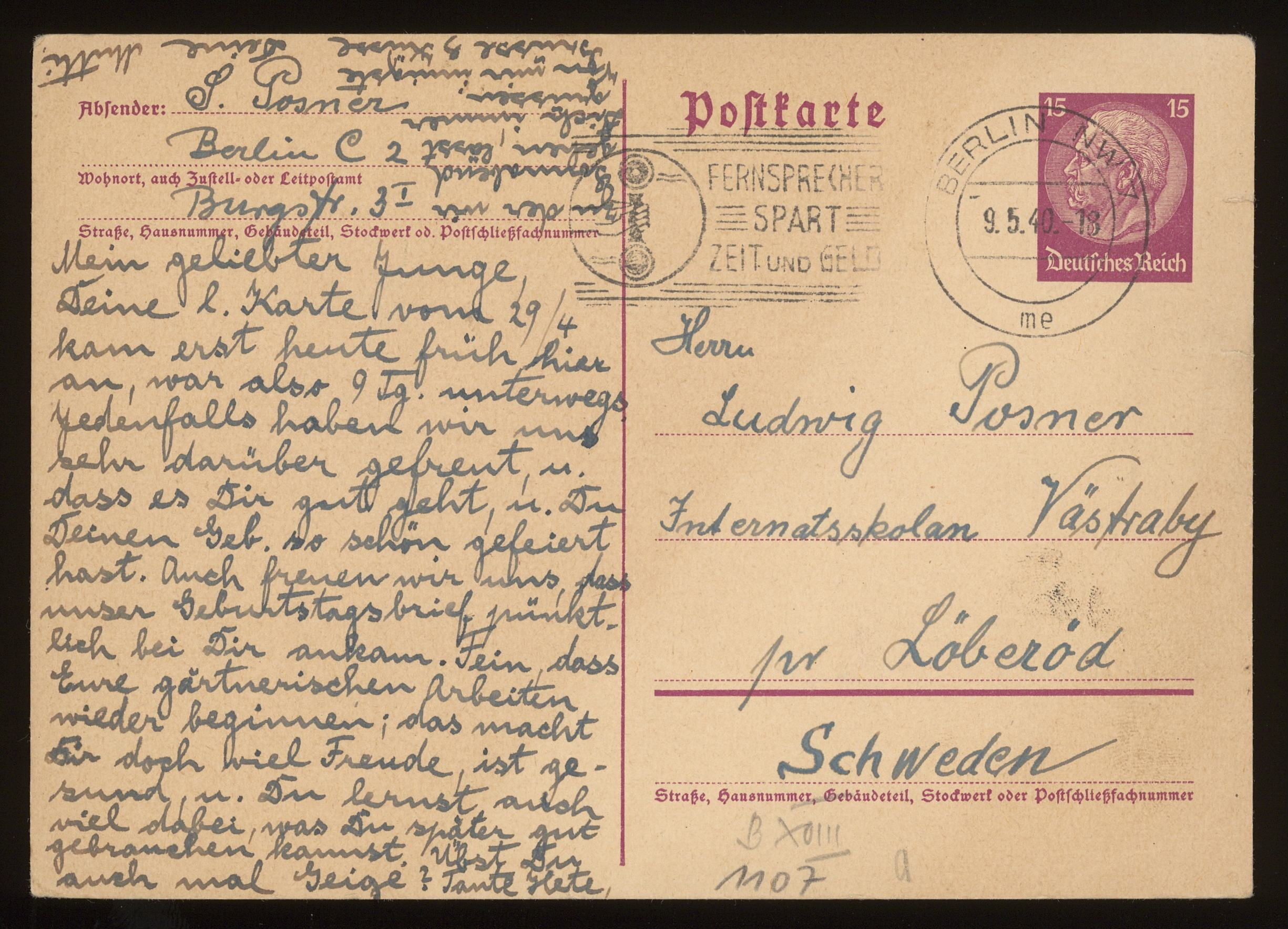 Brevkort från föräldrarna Anna och Siegfried Posner till sonen Ludwig Posner daterat 5 maj 1940.