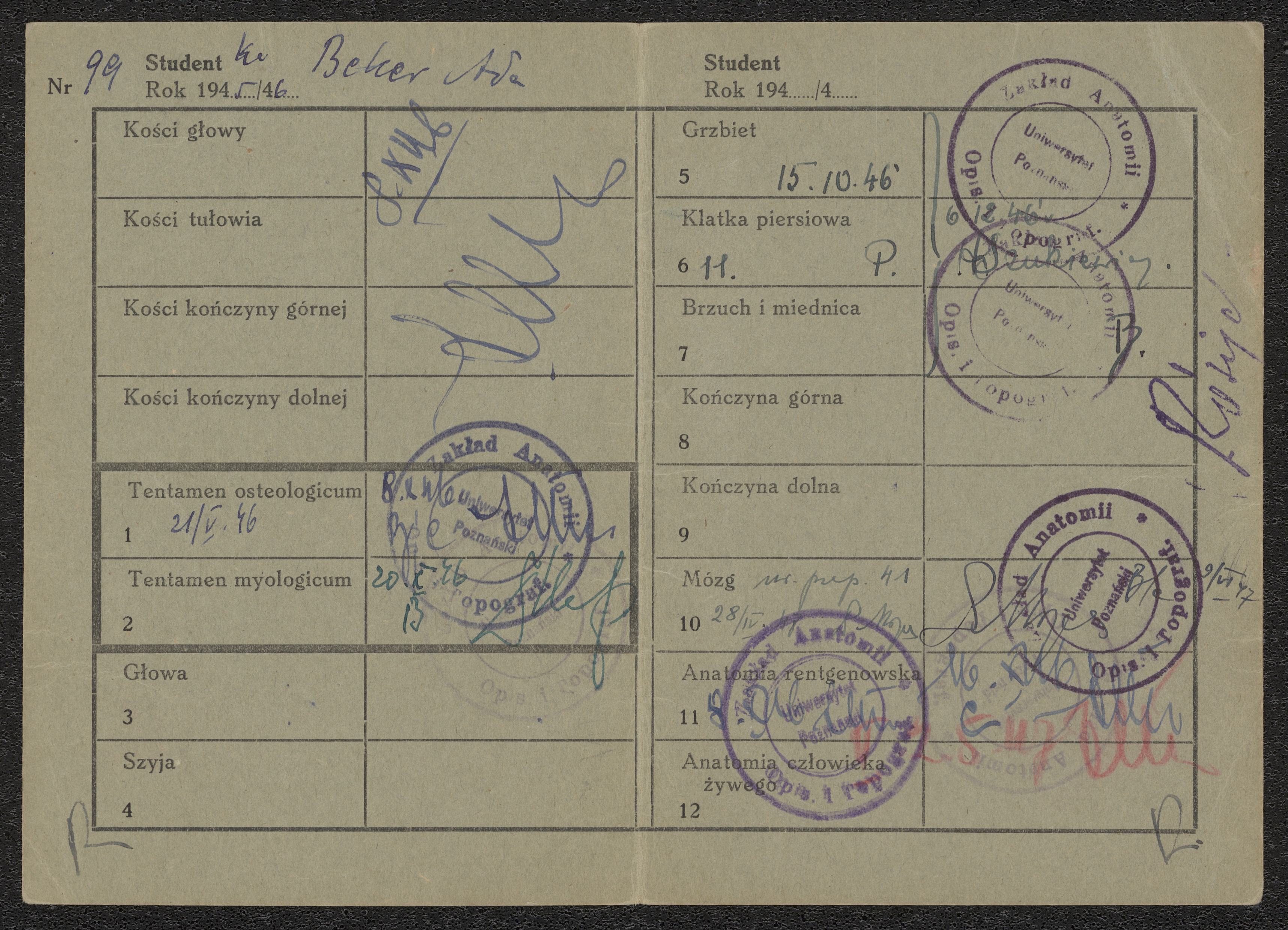 Intyg över Ada Beckers deltagande i medicinsk undervisning vid Poznans universitet 1945-1946.