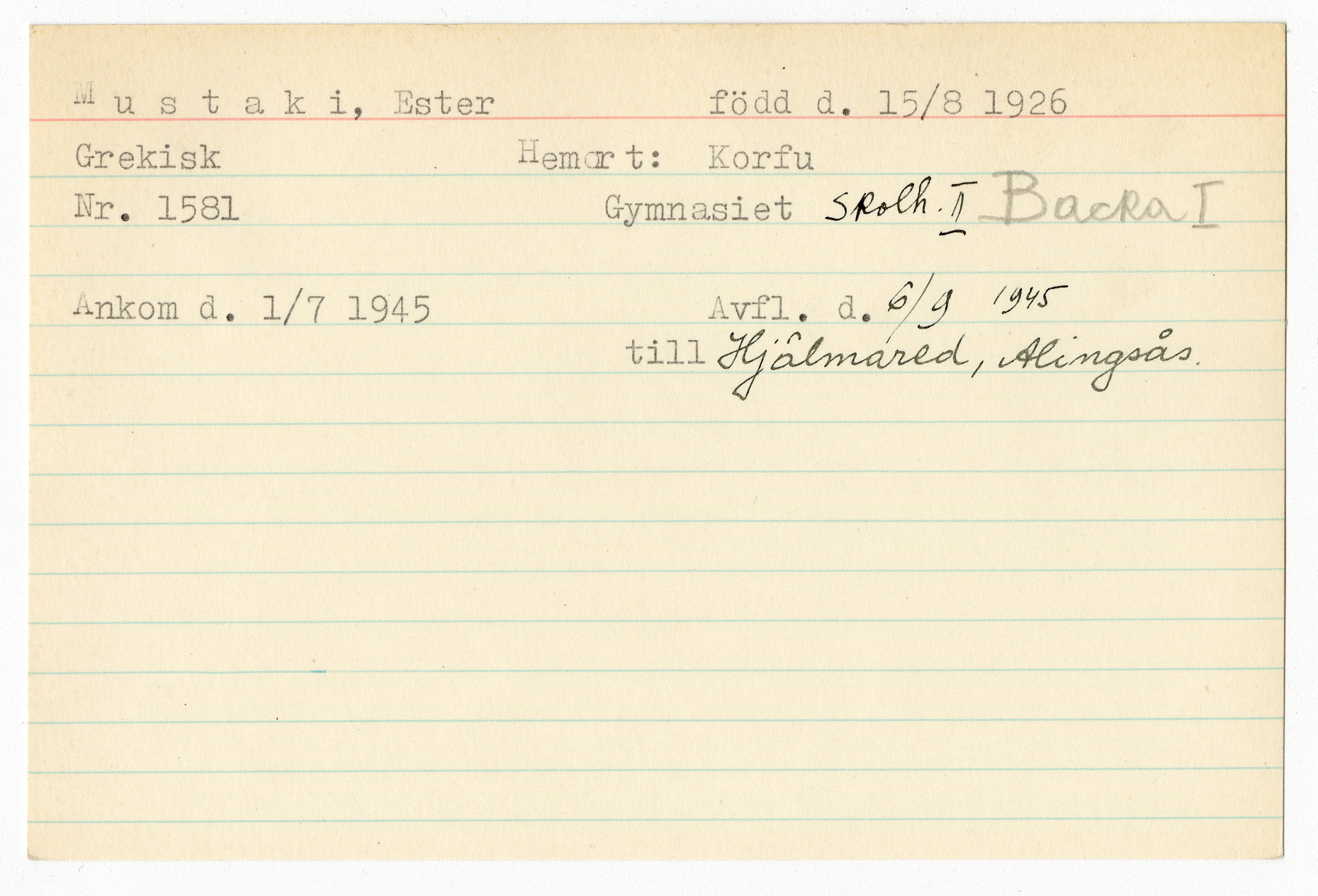 Ett skrivkort med patientuppgifter gällande Ester Mustaki.