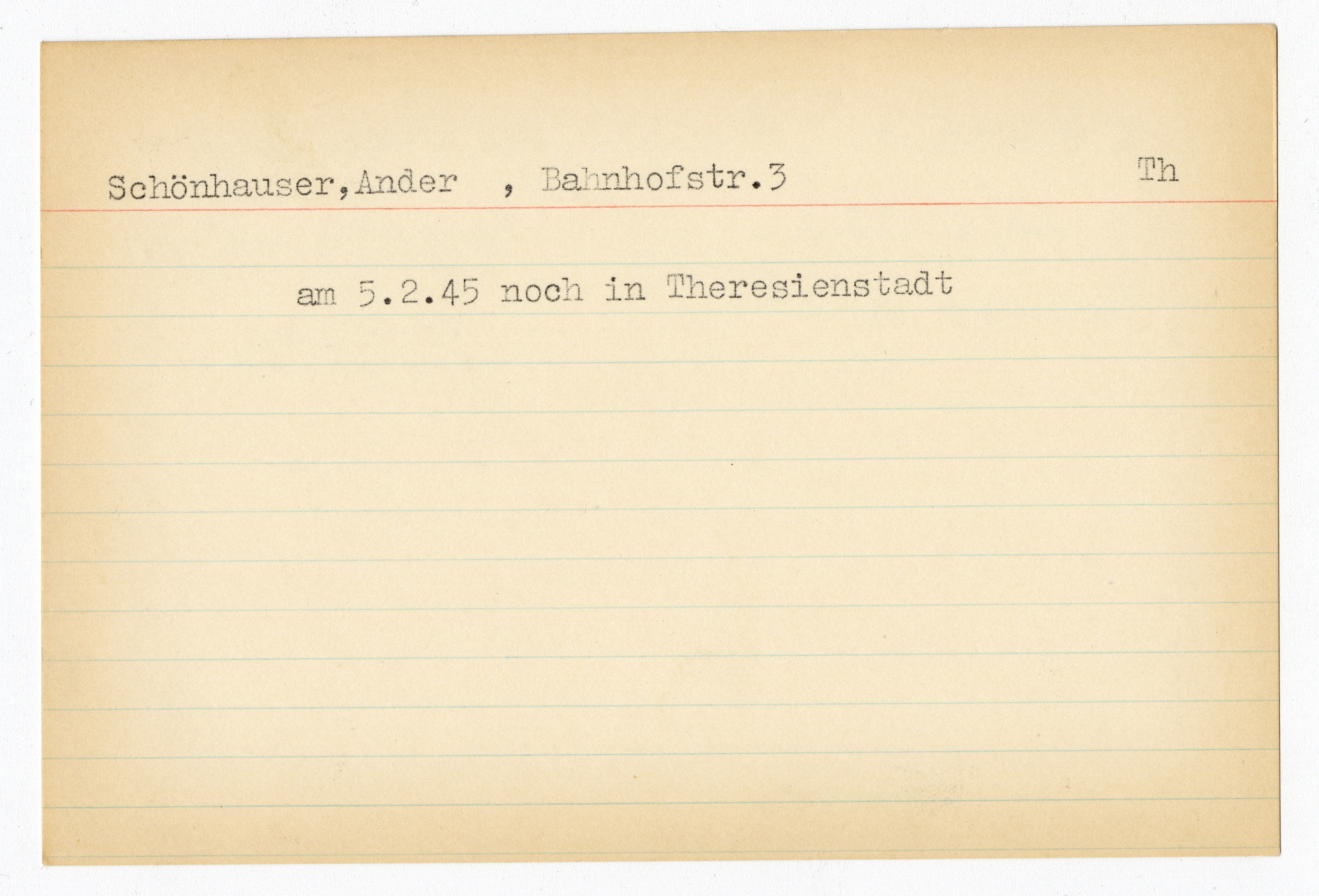Ett skrivkort med patientuppgifter gällande Magdalene Eckstein. På baksidan uppgifter om matpaket till Ander Schönehauser i Theresienstadt.