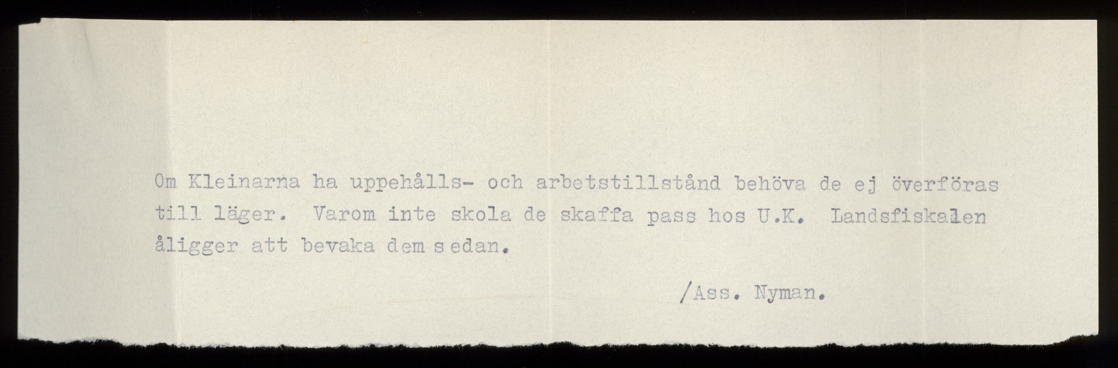 Ett dokument av assistent Nyman angående Elisabeth Klein.