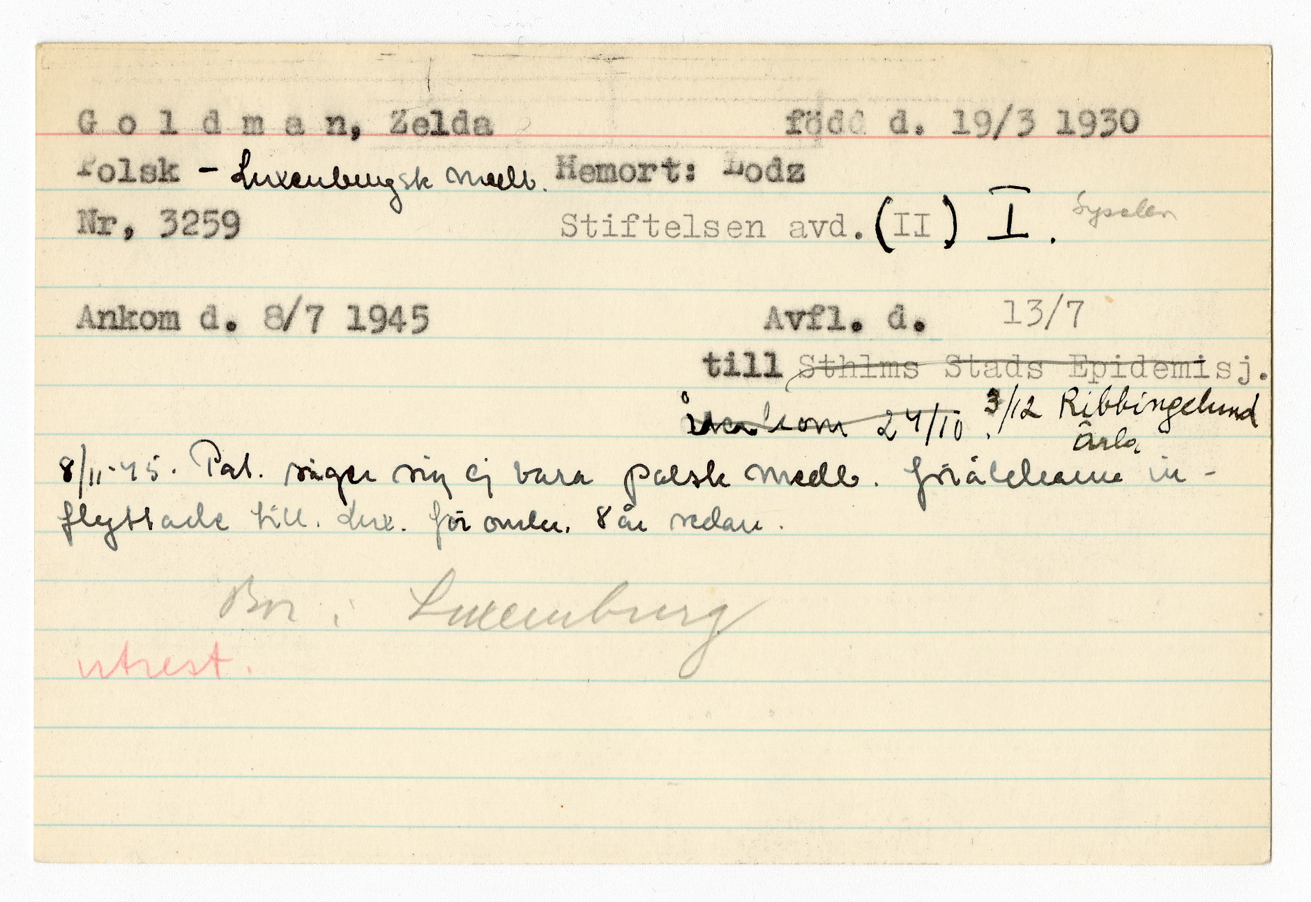 Ett skrivkort med patientuppgifter gällande Zelda Goldman.