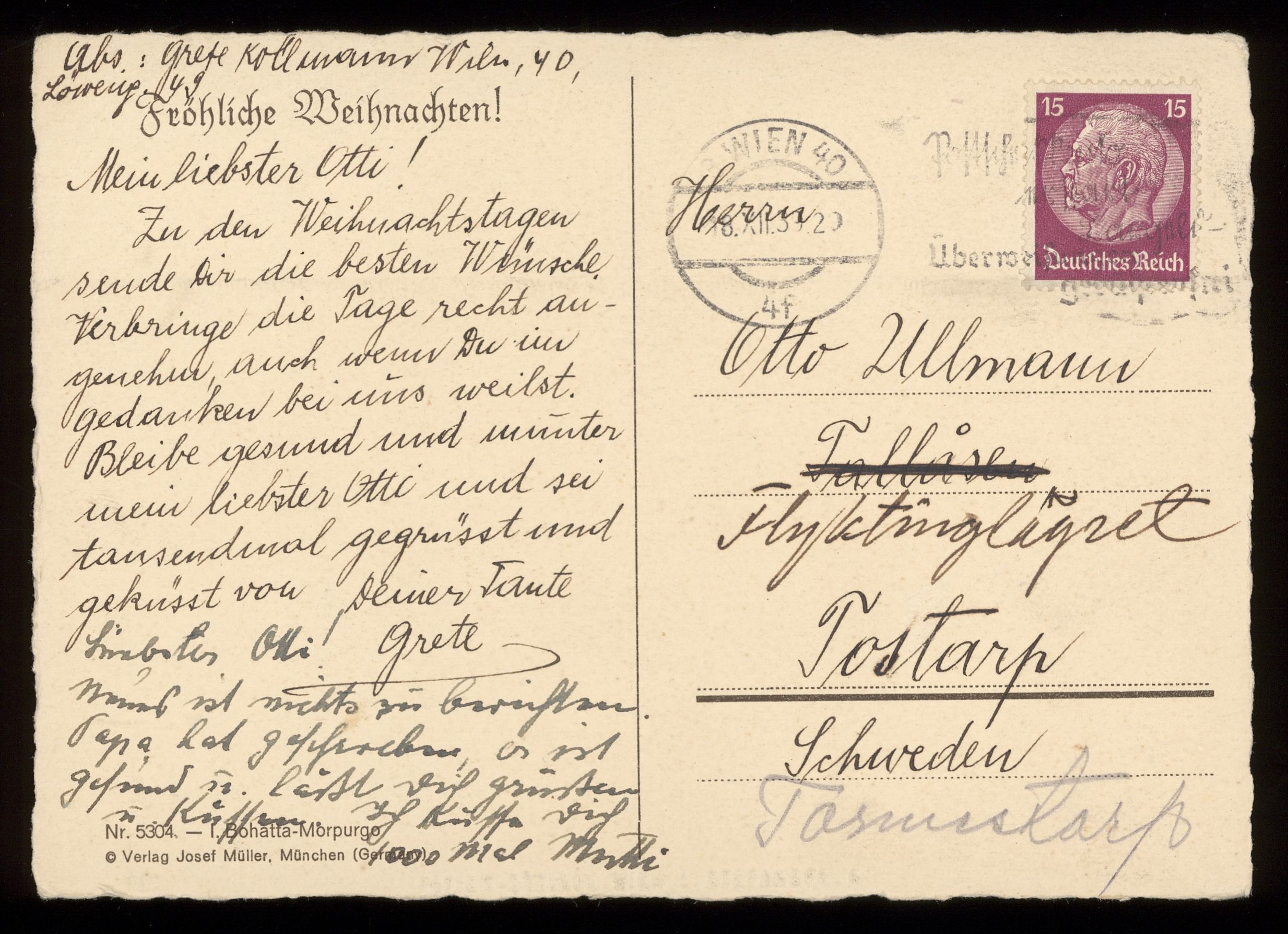 Vykort till Otto Ullman med illustration av Ida Bohatta-Morpurgo från mamma Elise Ullmann (född Kollmann) och moster Grete Kollmann daterat 18 december 1939 Wien.