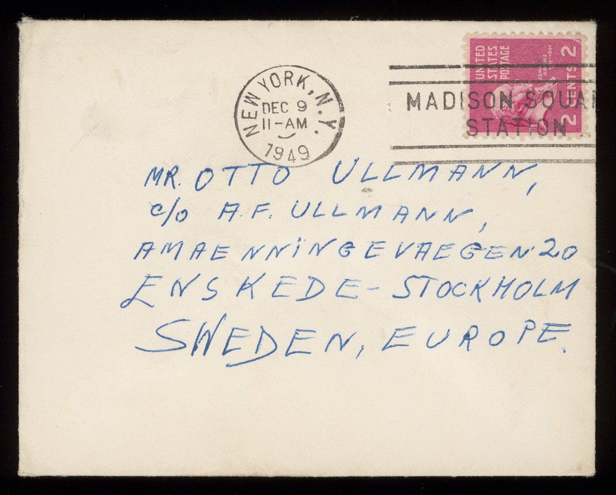 Brev till Otto Ullman från farbror Egon Ullmann och faster Alice "Lizzy" Ullmann daterat 9 december 1949 New York.