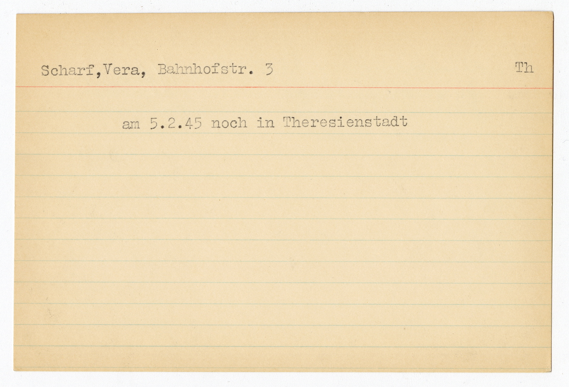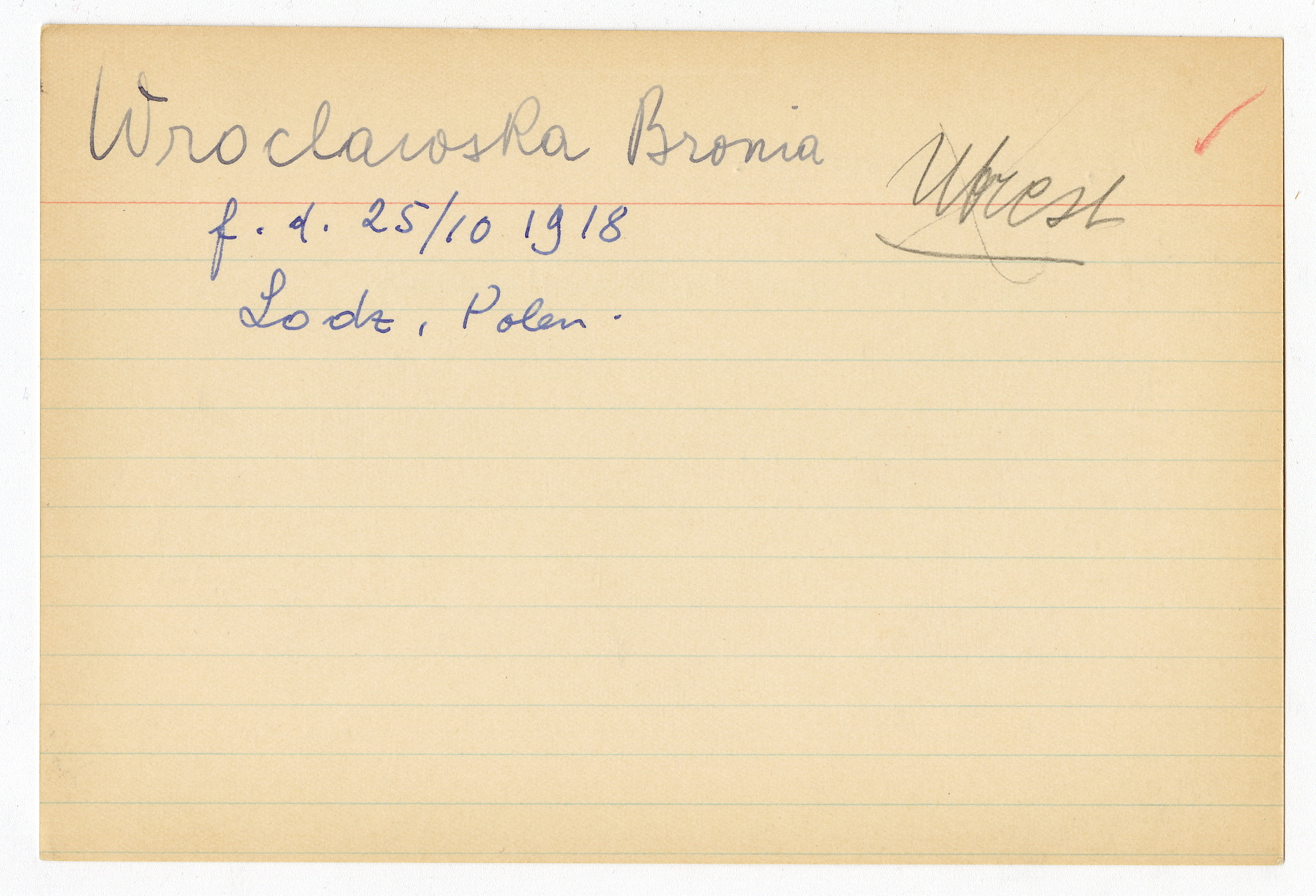 Ett skrivkort med patientuppgifter gällande Bronia Wroclawska. På baksidan uppgifter om matpaket till Vera Scharf i Theresienstadt.