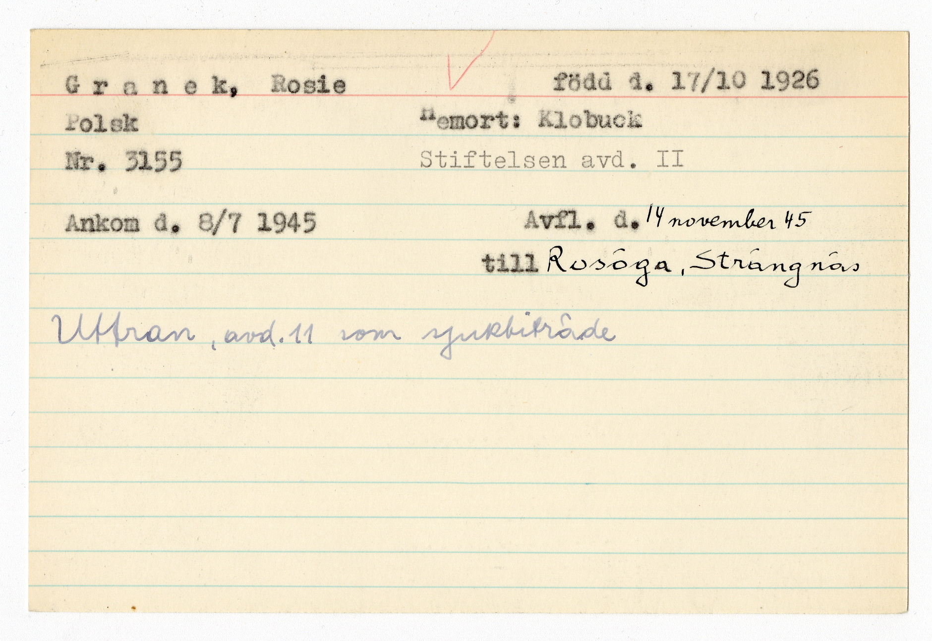 Ett skrivkort med patientuppgifter gällande Rosie Granek.