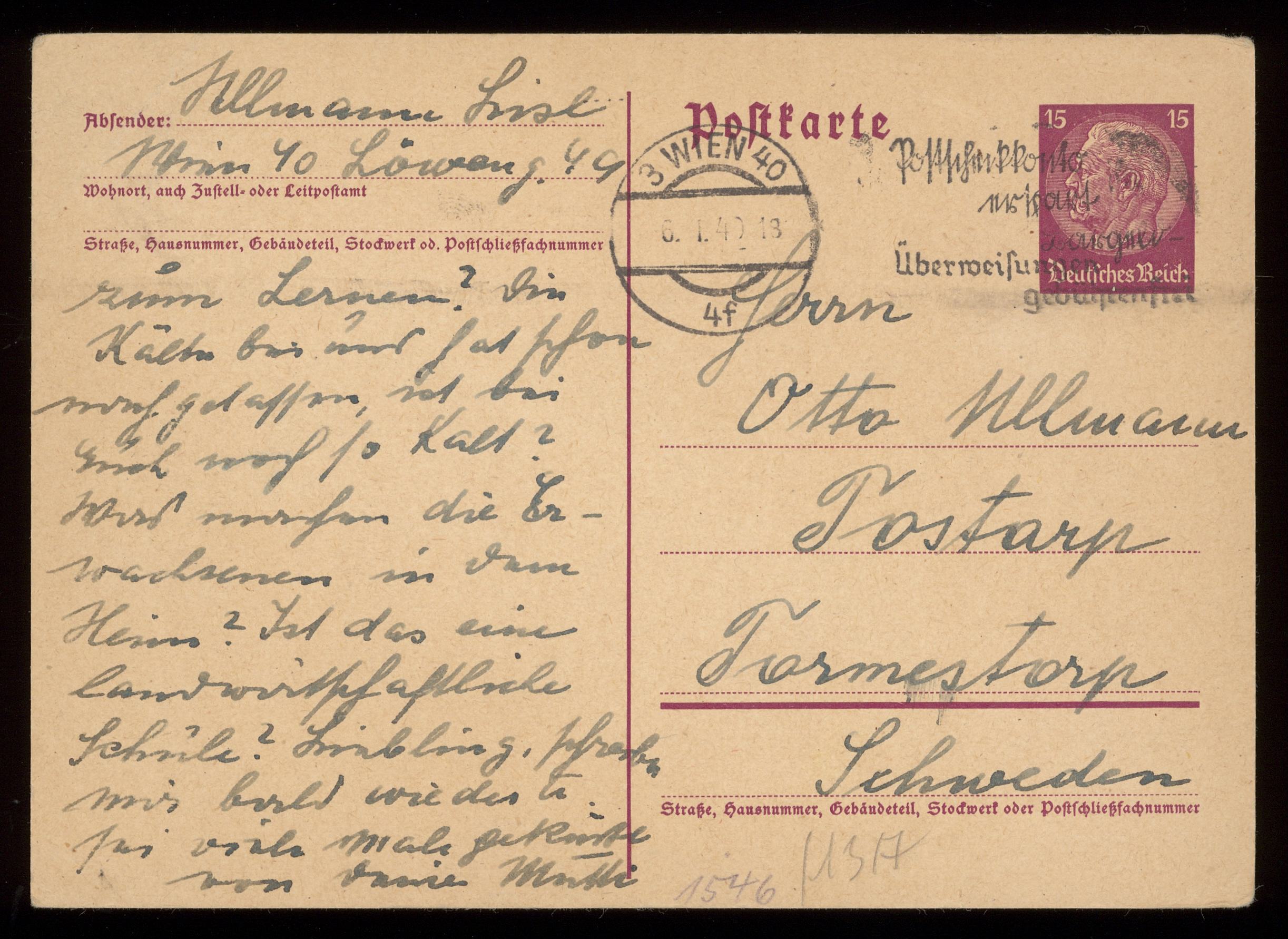 Brev till Otto Ullman från föräldrarna Josef och Elise Ullmann daterat 6 januari 1940 Wien.