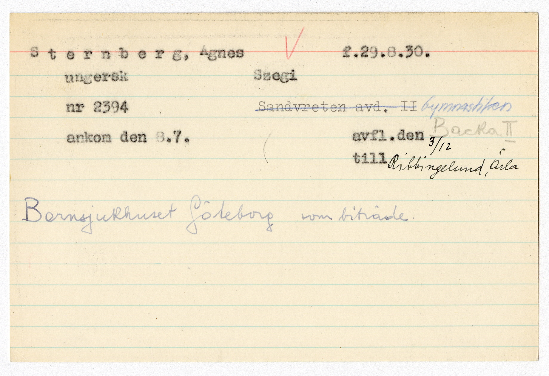 Ett skrivkort med patientuppgifter gällande Agnes Sternberg.