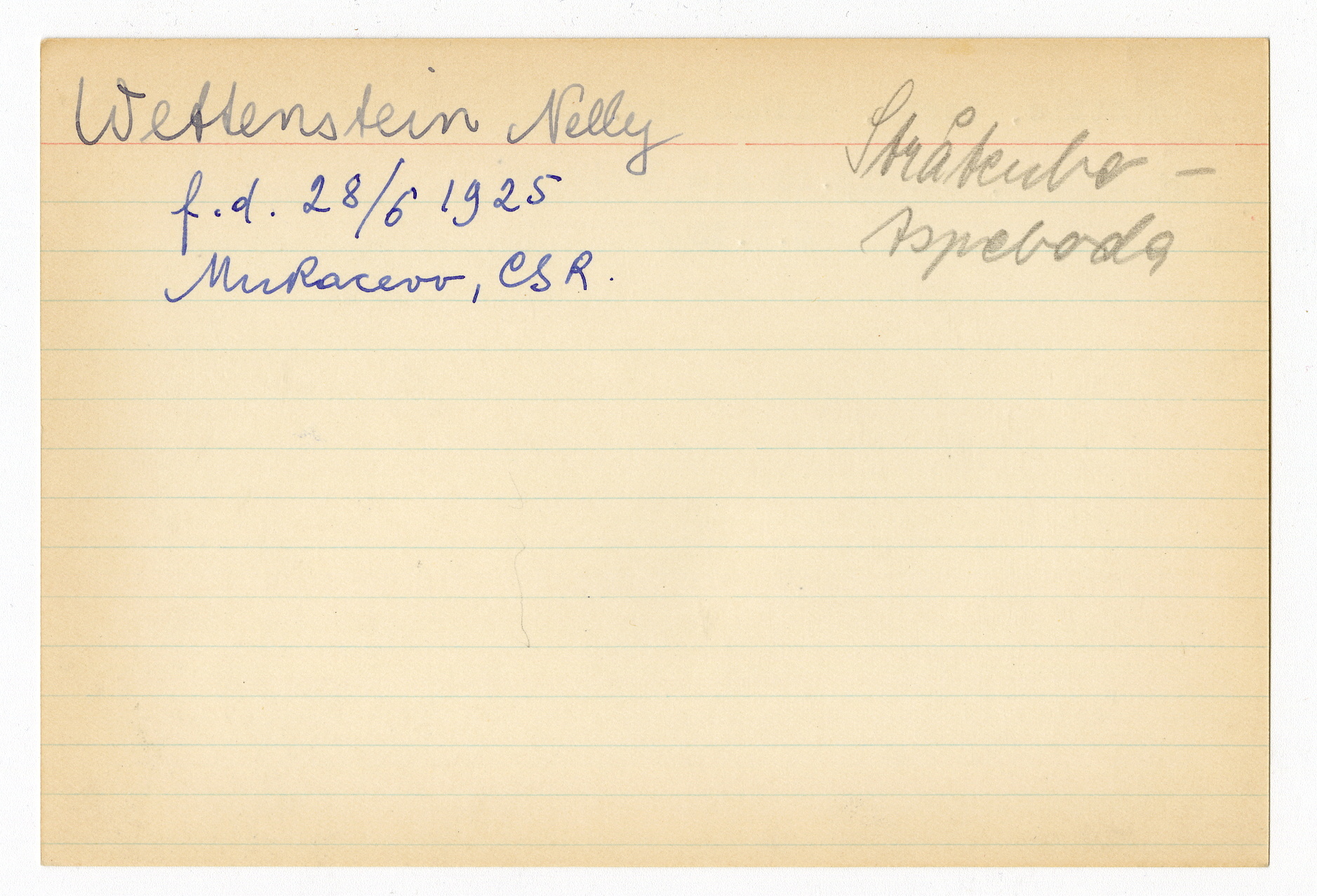 Ett skrivkort med patientuppgifter gällande Nelly Wettenstein. På baksidan uppgifter om matpaket till Berta Schöttle i Theresienstadt.