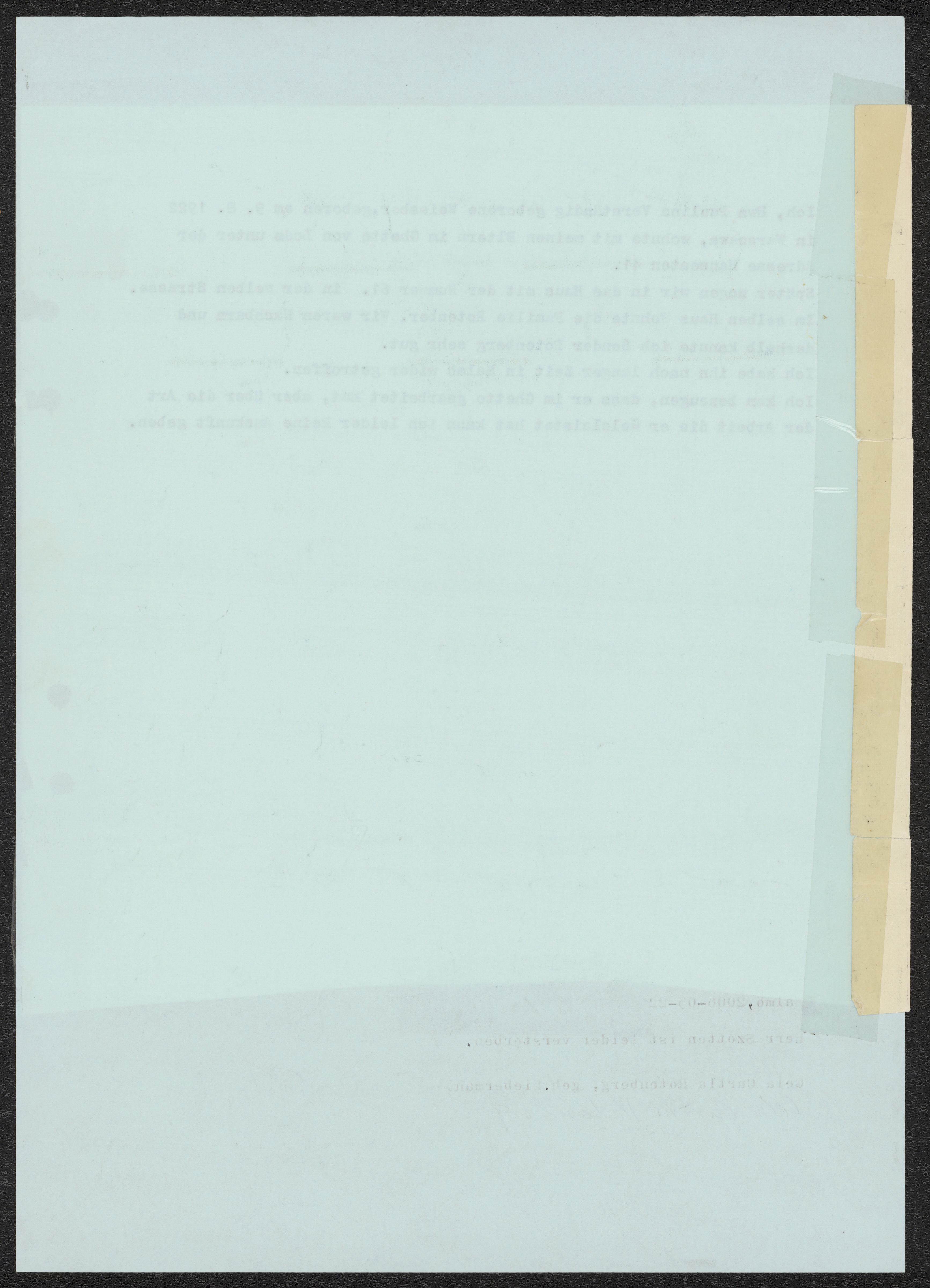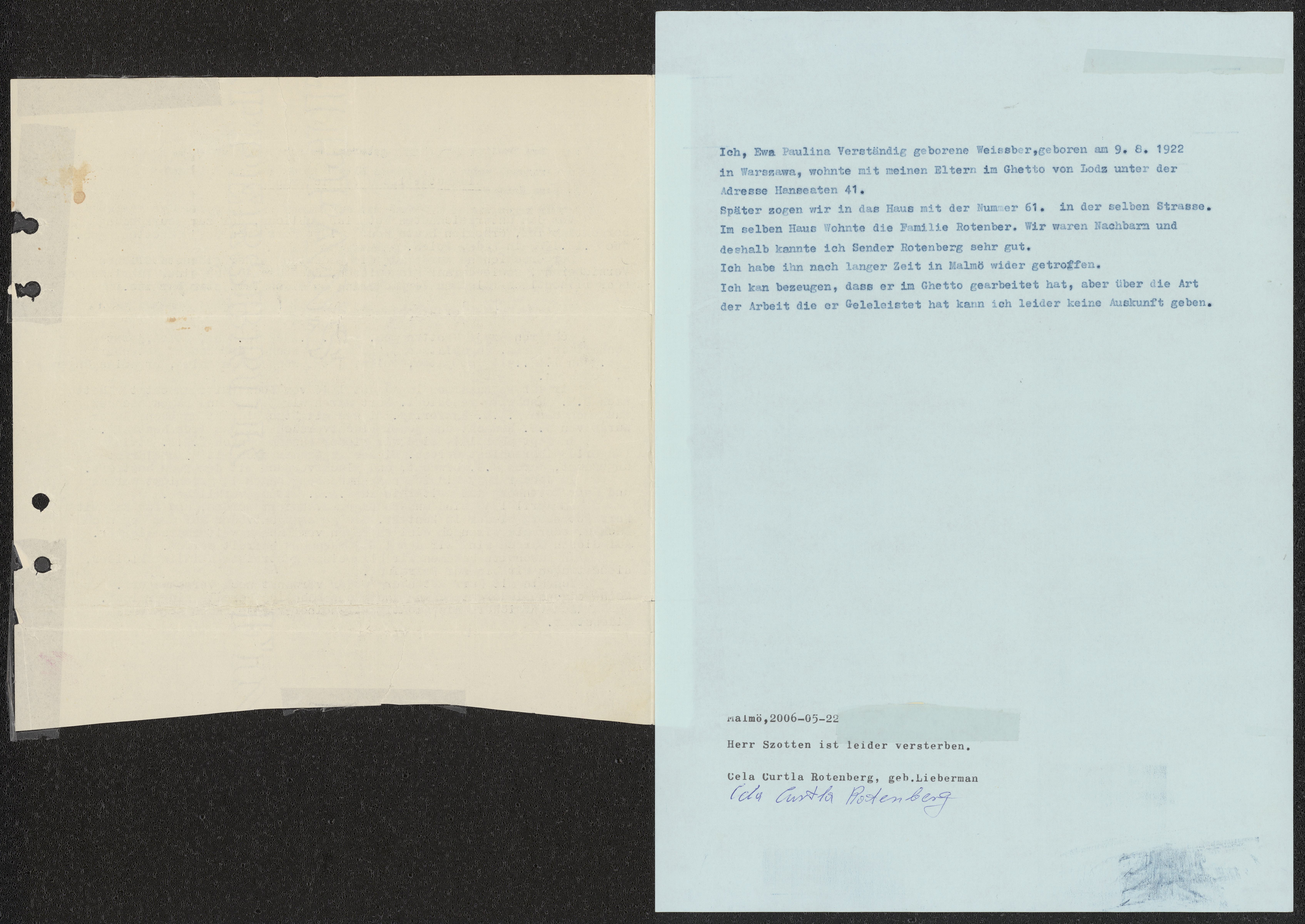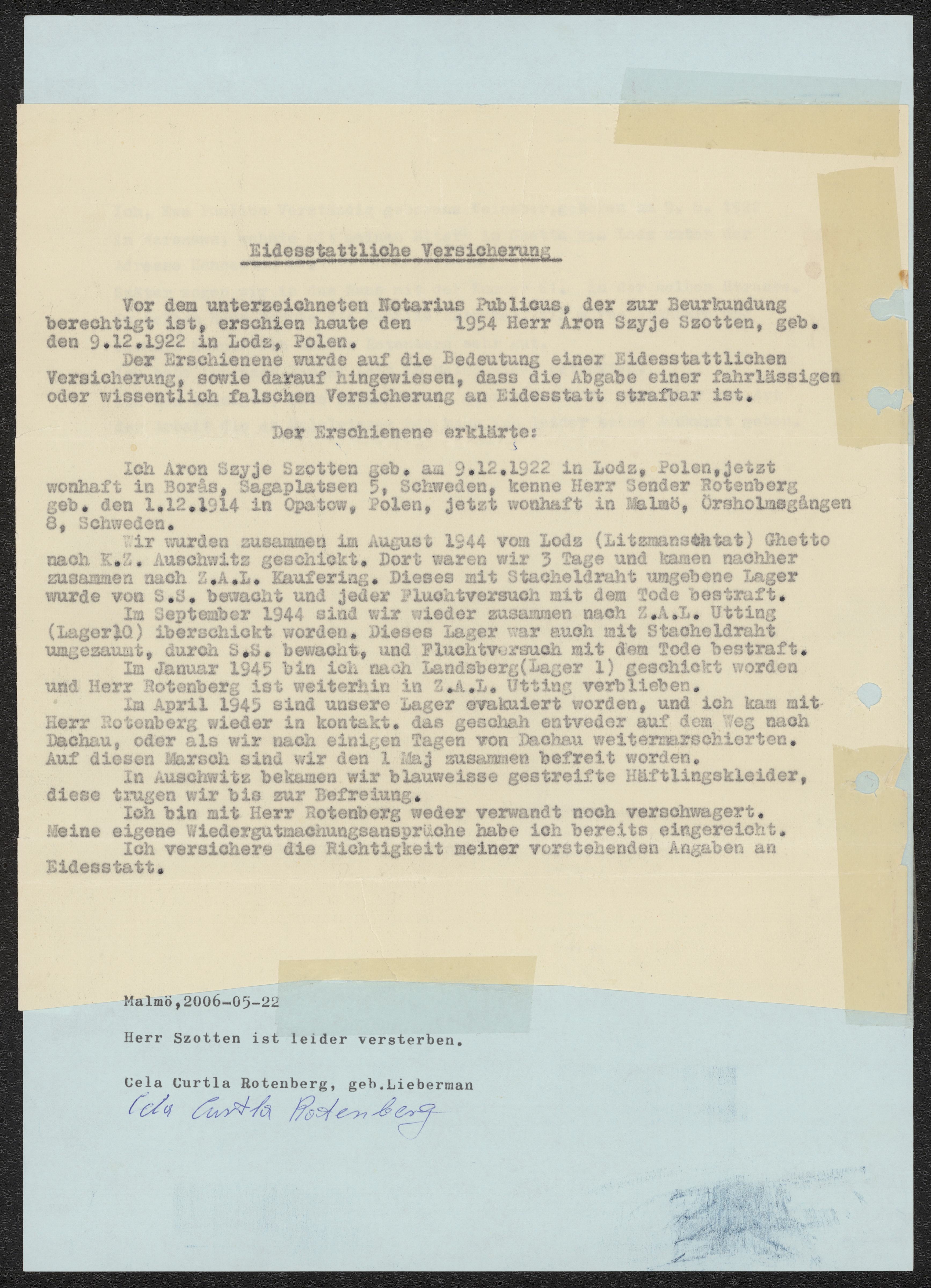 Vittnesmål av Aron Szyje Szotten från 1954, fasttejpad på ett blått papper med information att han avlidit.