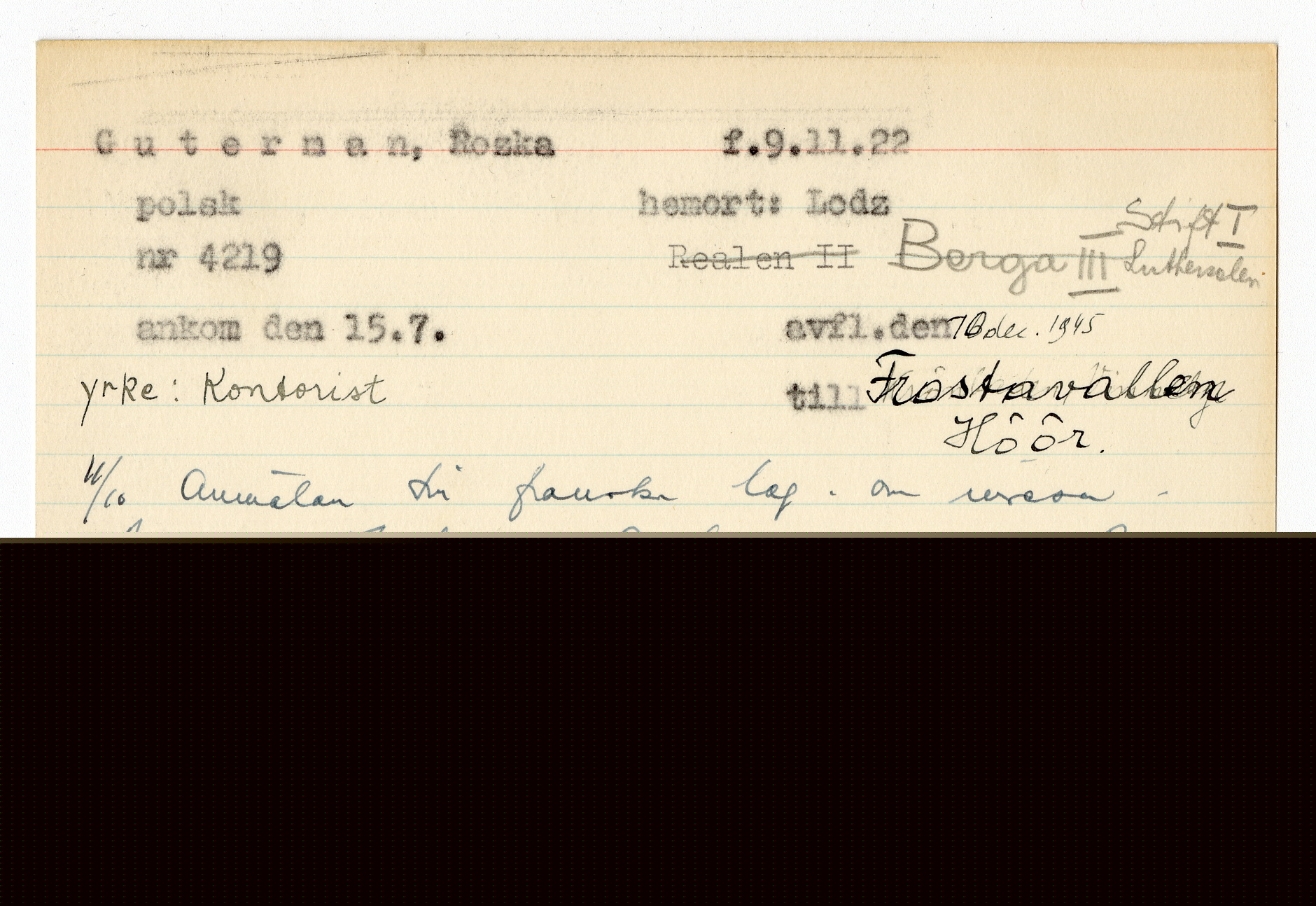 Ett skrivkort med patientuppgifter gällande Rozka Guterman.