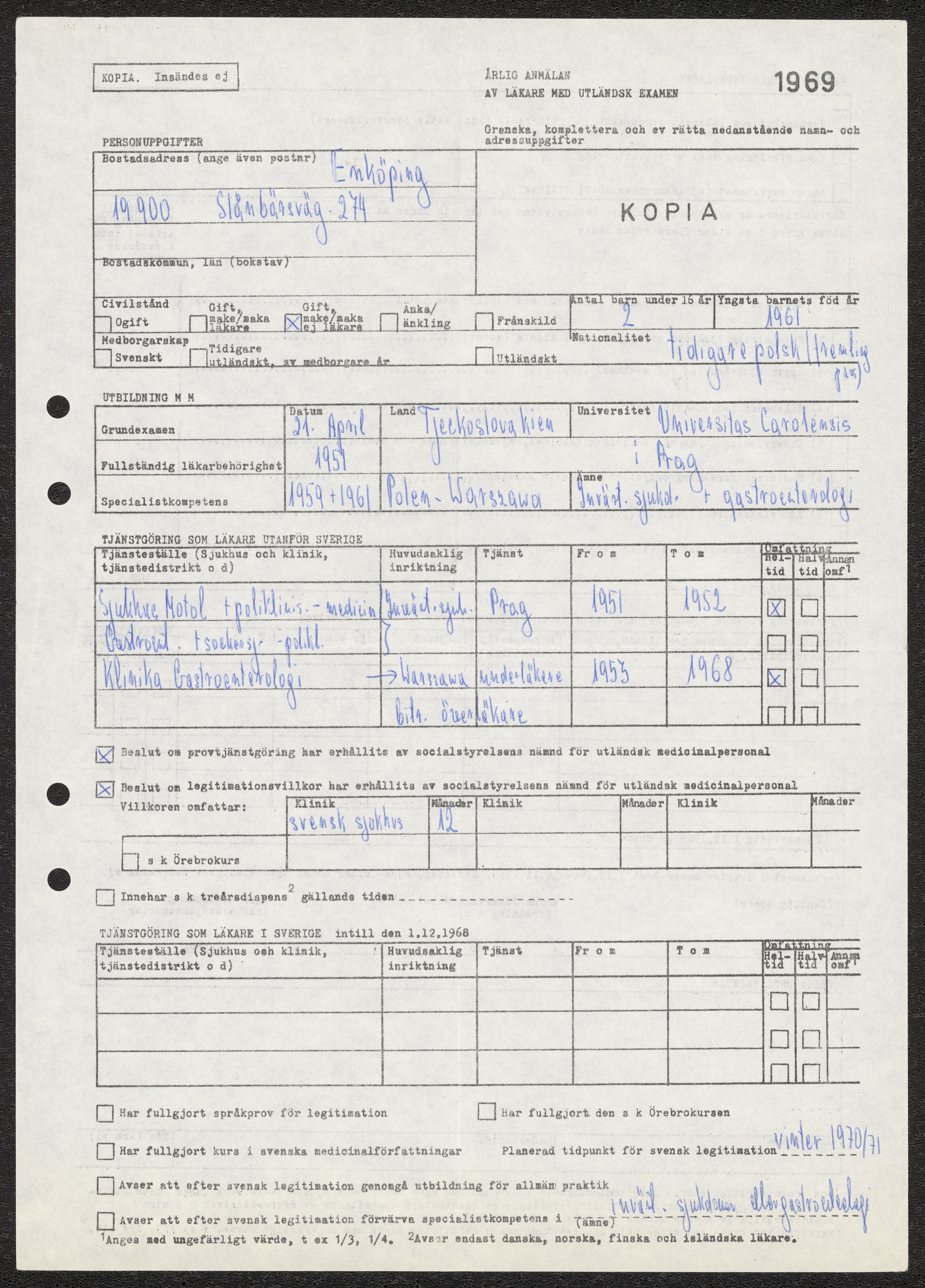 Årlig anmälan av läkare med utländsk examen 1969