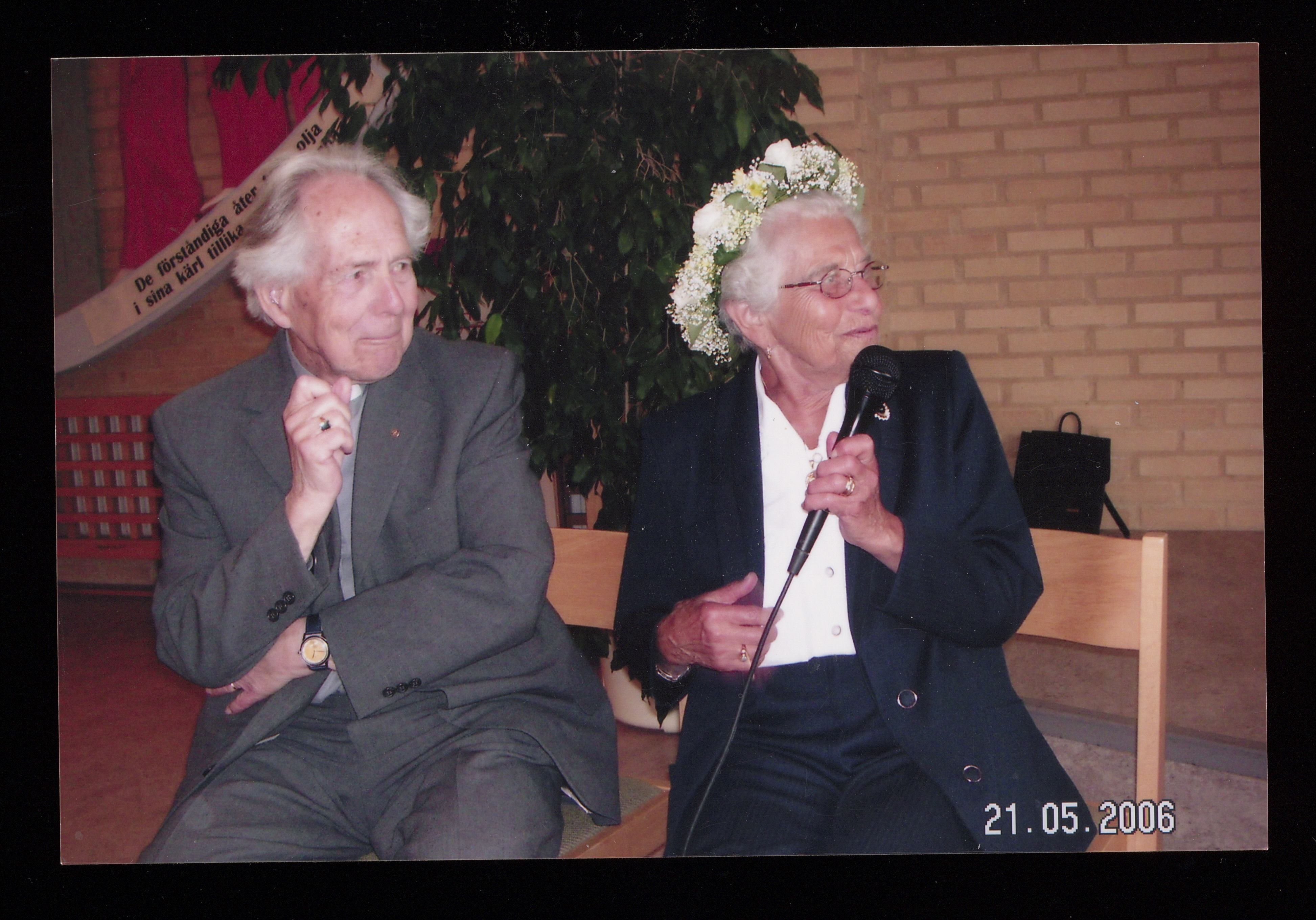 Rosa tillsammans med en präst. Hon talar i mikrofon, och på huvudet har Rosa en blomsterkrans. Bilden är tagen i samband med Hakarps församlings uppmärksammande av hennes 80-årsdag. Rosa var mycket aktiv i församlingen. På baksidan finns texten: 0707299131.