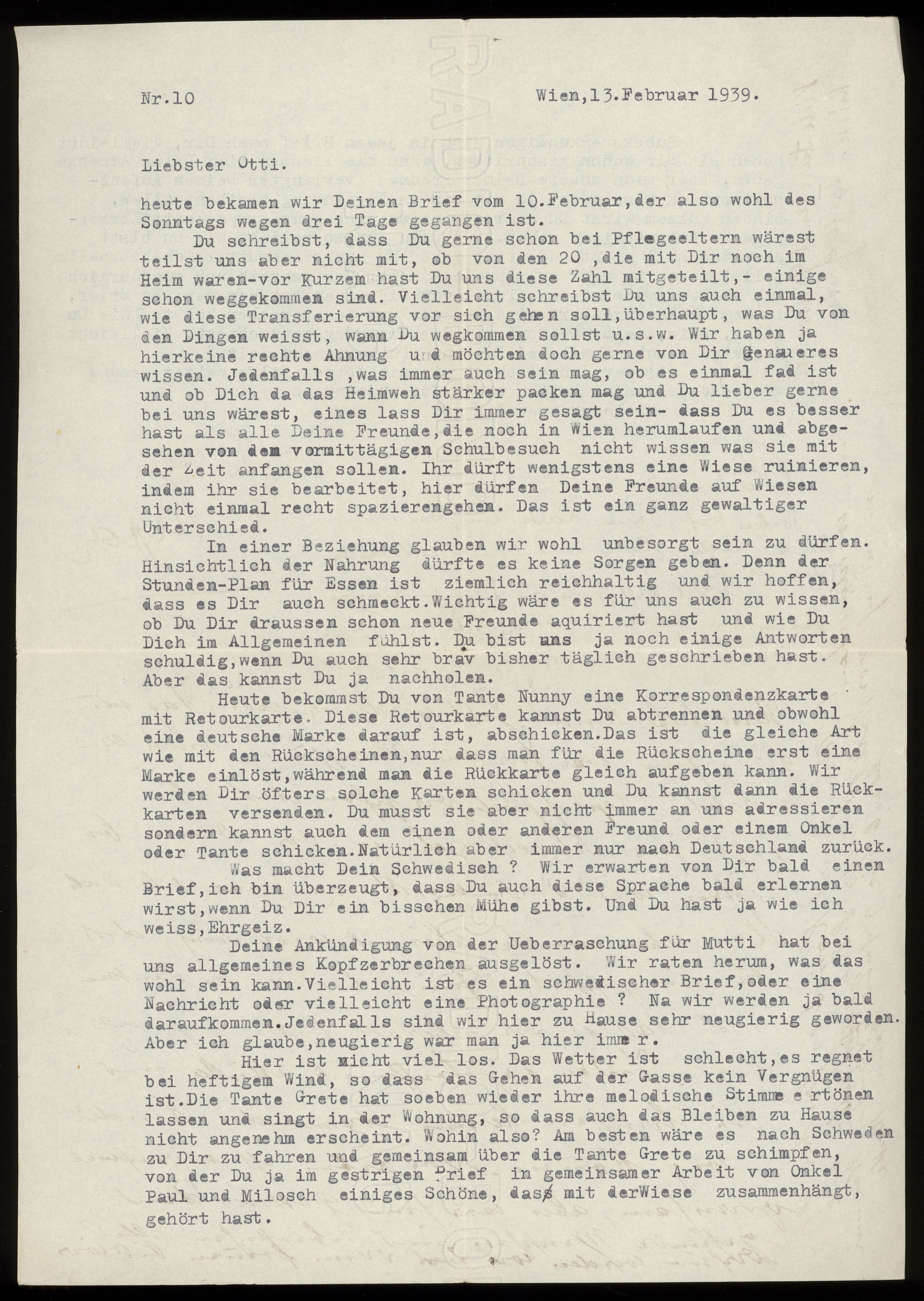 Maskinskrivet brev till Otto Ullman från föräldrarna Josef och Elise Ullmann och moster Grete Kollmann daterat 13 februari 1939 Wien.