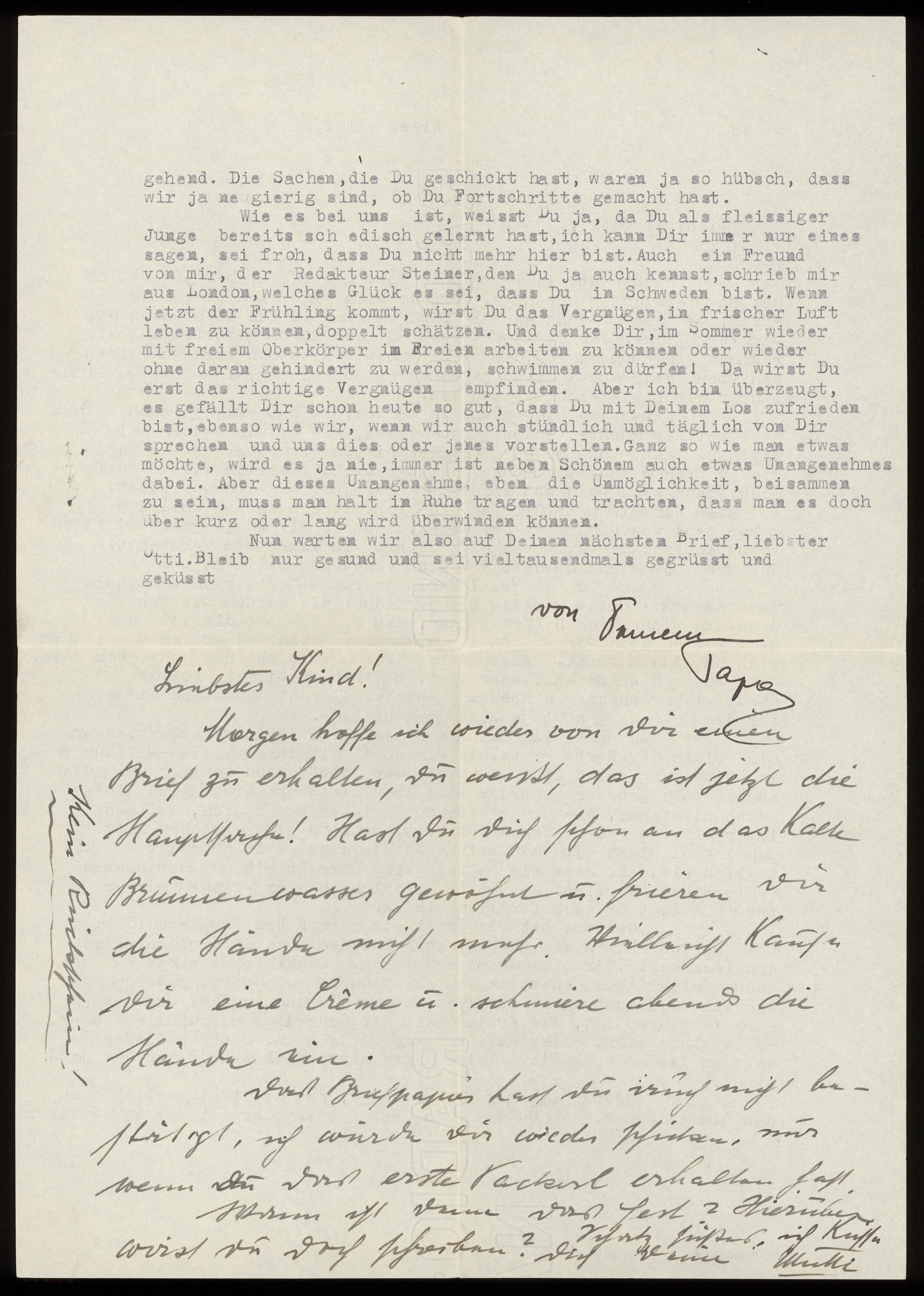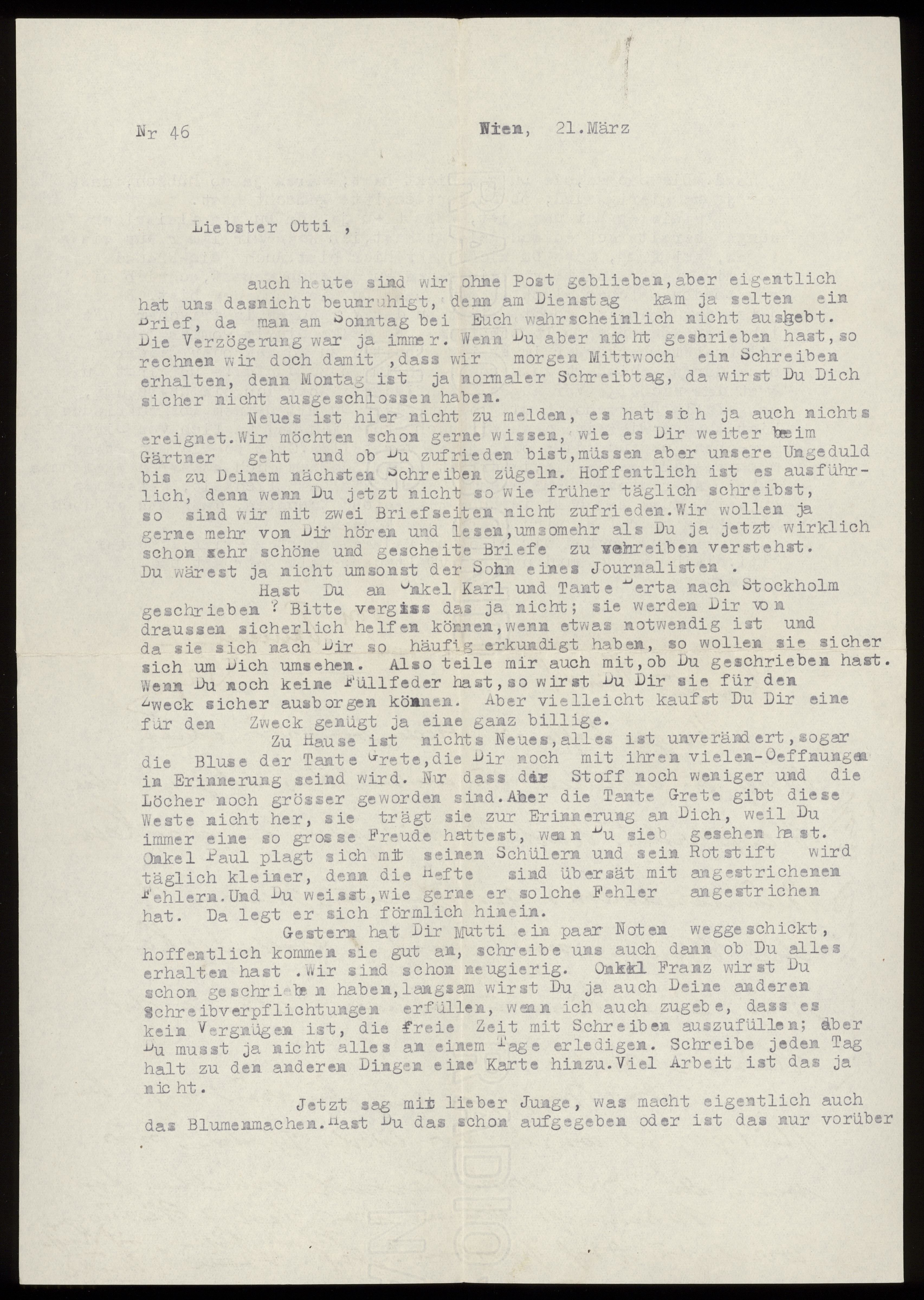 Maskinskrivet brev till Otto Ullman från föräldrarna Josef och Elise Ullmann daterat 21 mars 1939 Wien.
