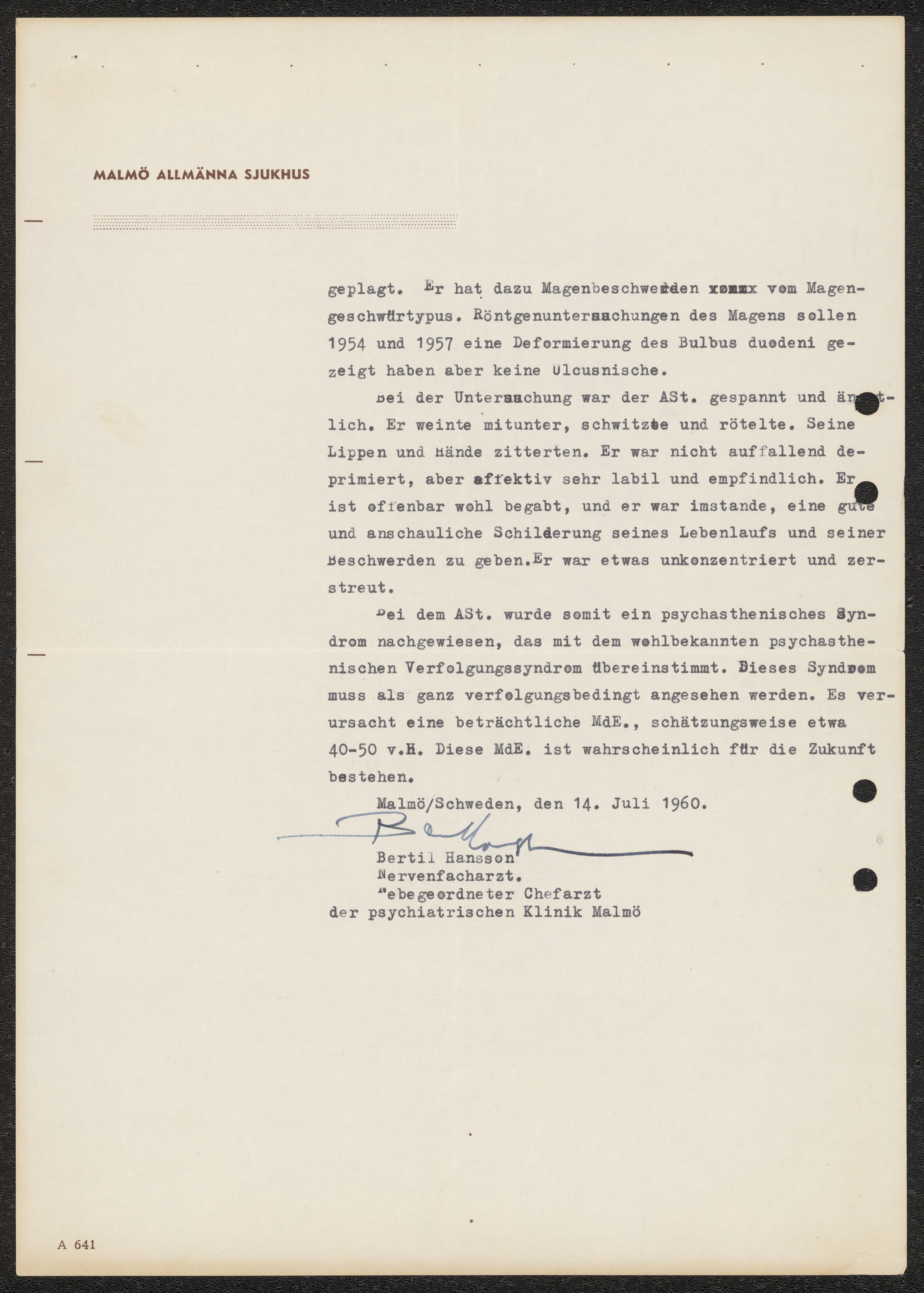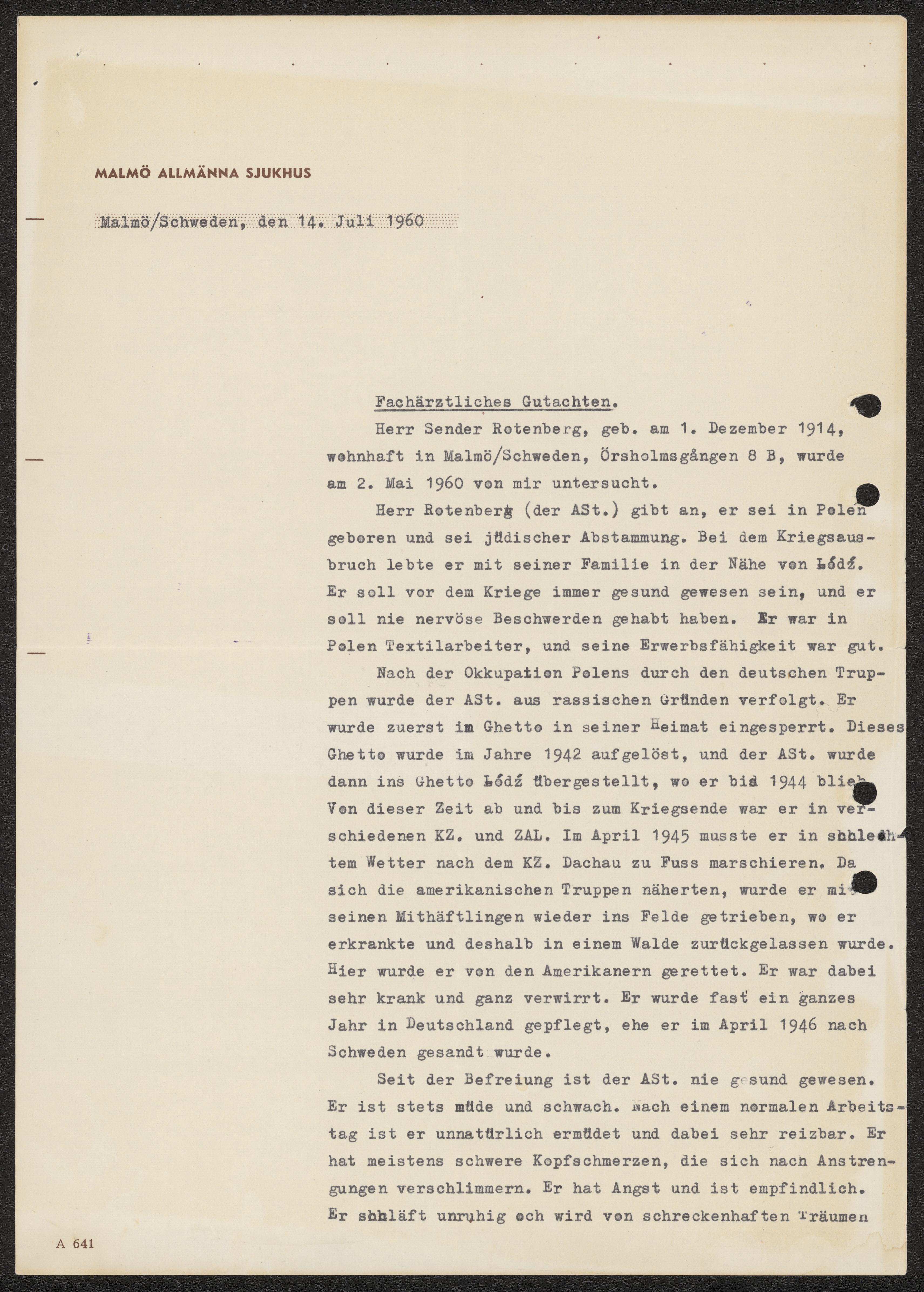 Sjukintyg från psykiatriker om Sender Rotenbergs nedsatta arbetsförmåga på grund av vistelse i koncentrationsläger. Skrivet på tyska i syfte att utverka skadestånd