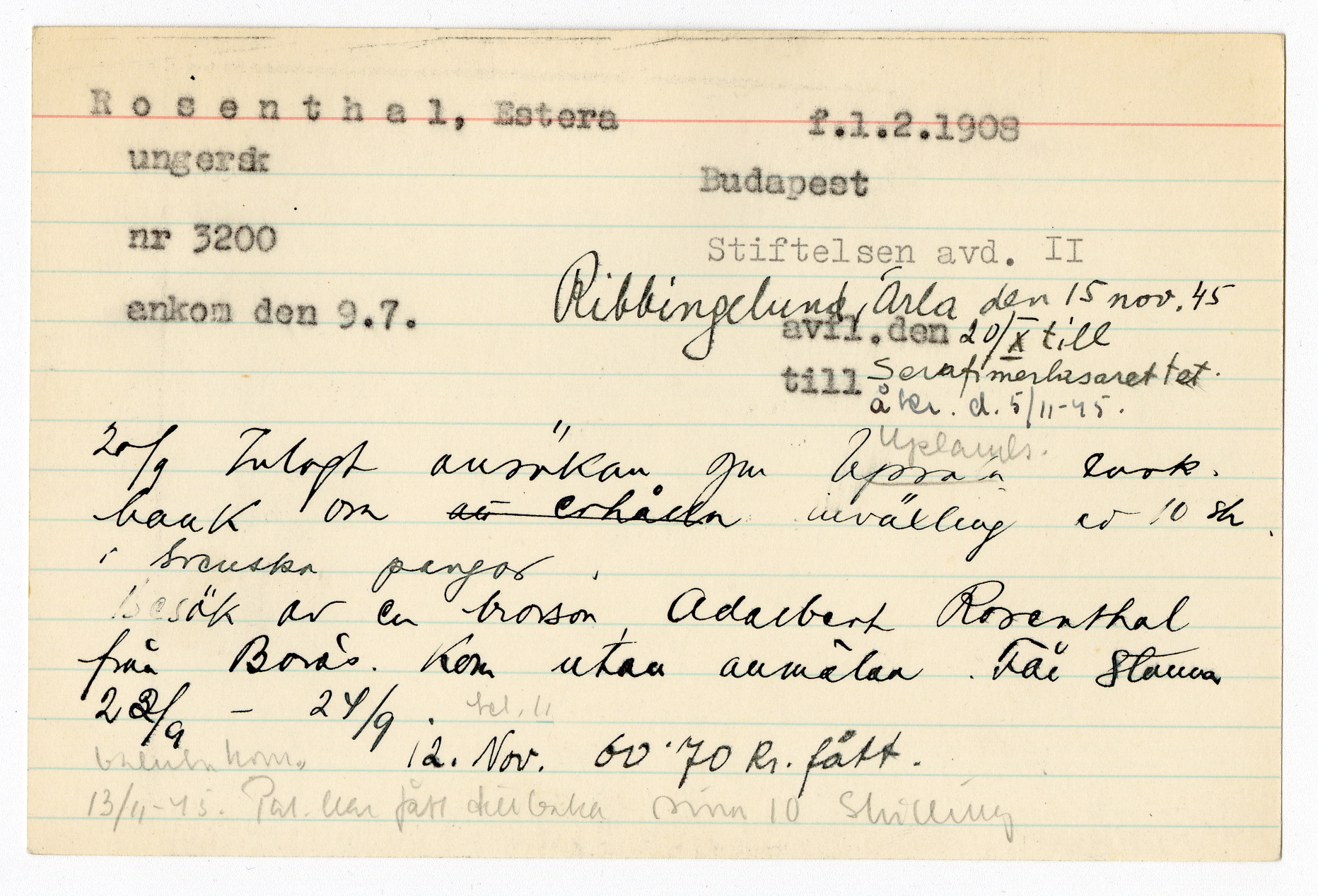 Ett skrivkort med patientuppgifter gällande Estera Rosenthal.