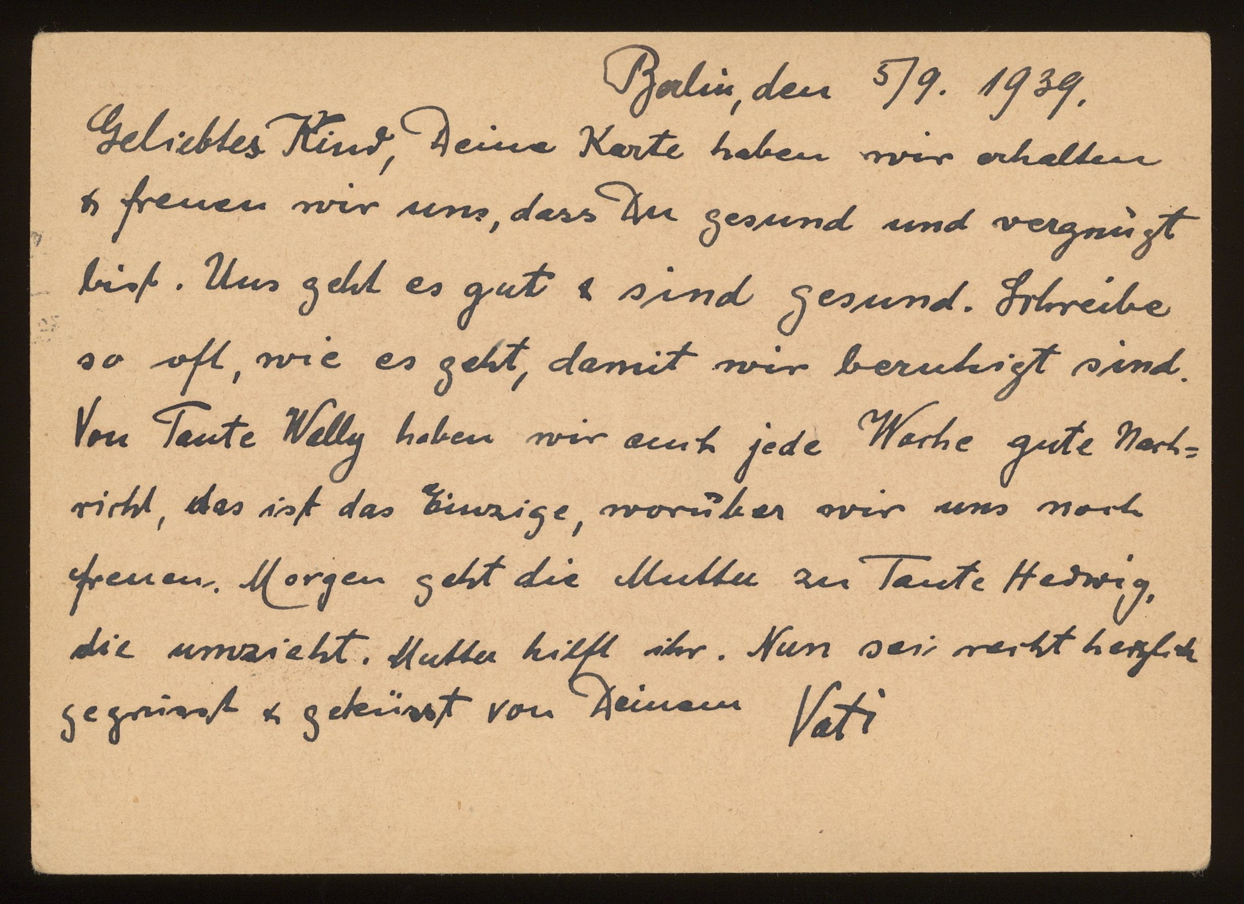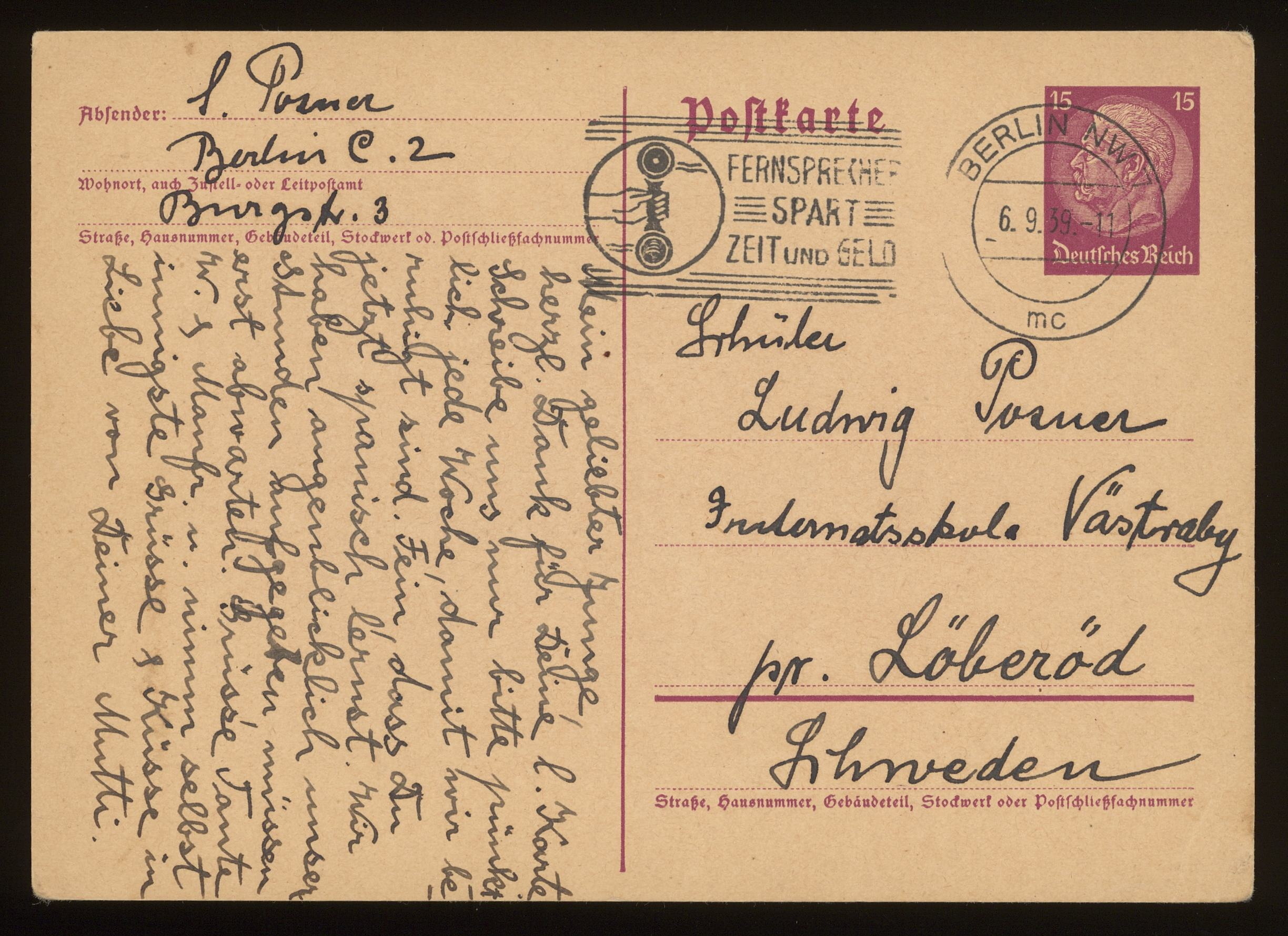 Brevkort från föräldrarna Anna och Siegfried Posner till sonen Ludwig Posner daterat 5 september 1939.