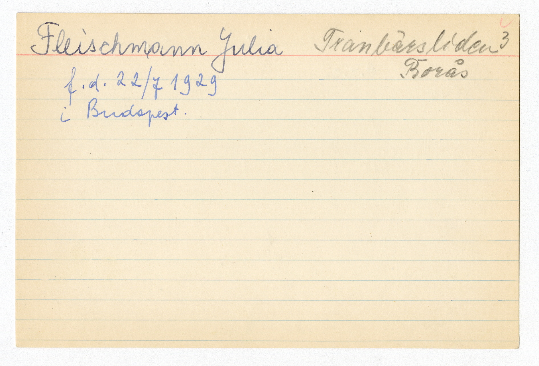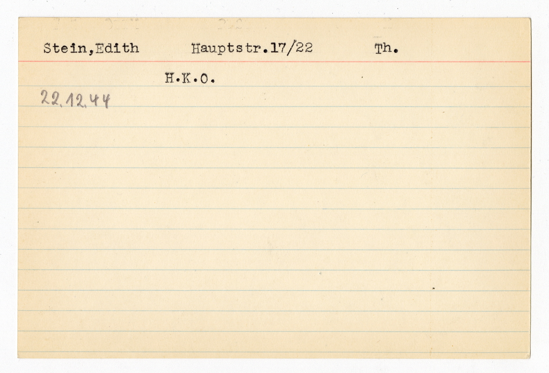 Ett skrivkort med patientuppgifter gällande Julia Fleischmann. På baksidan uppgifter om matpaket till Edith Stein i Theresienstadt.