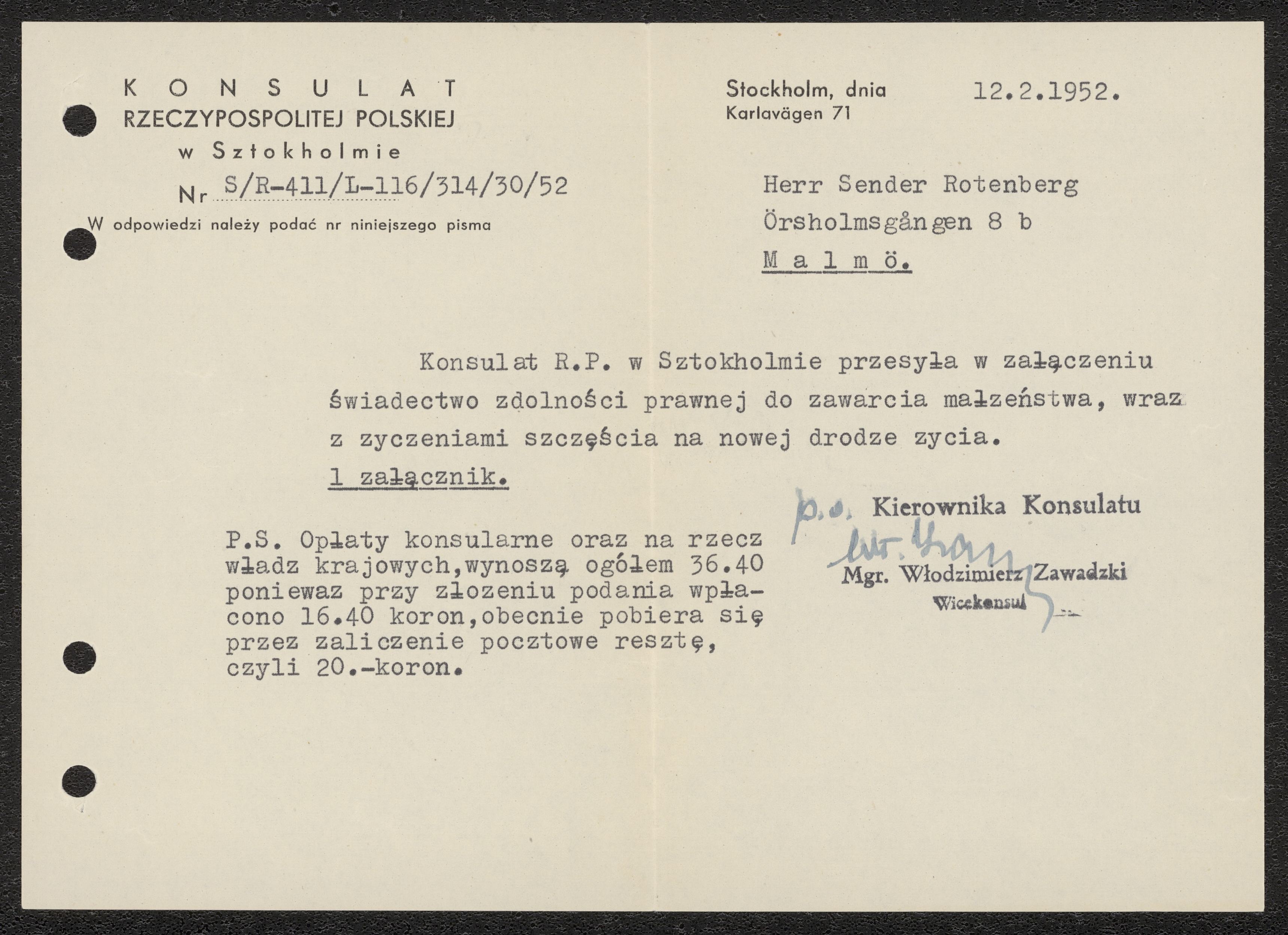Handling från polska konsulatet om beslut om möjligheten för Sender Rotenberg att gifta om sig