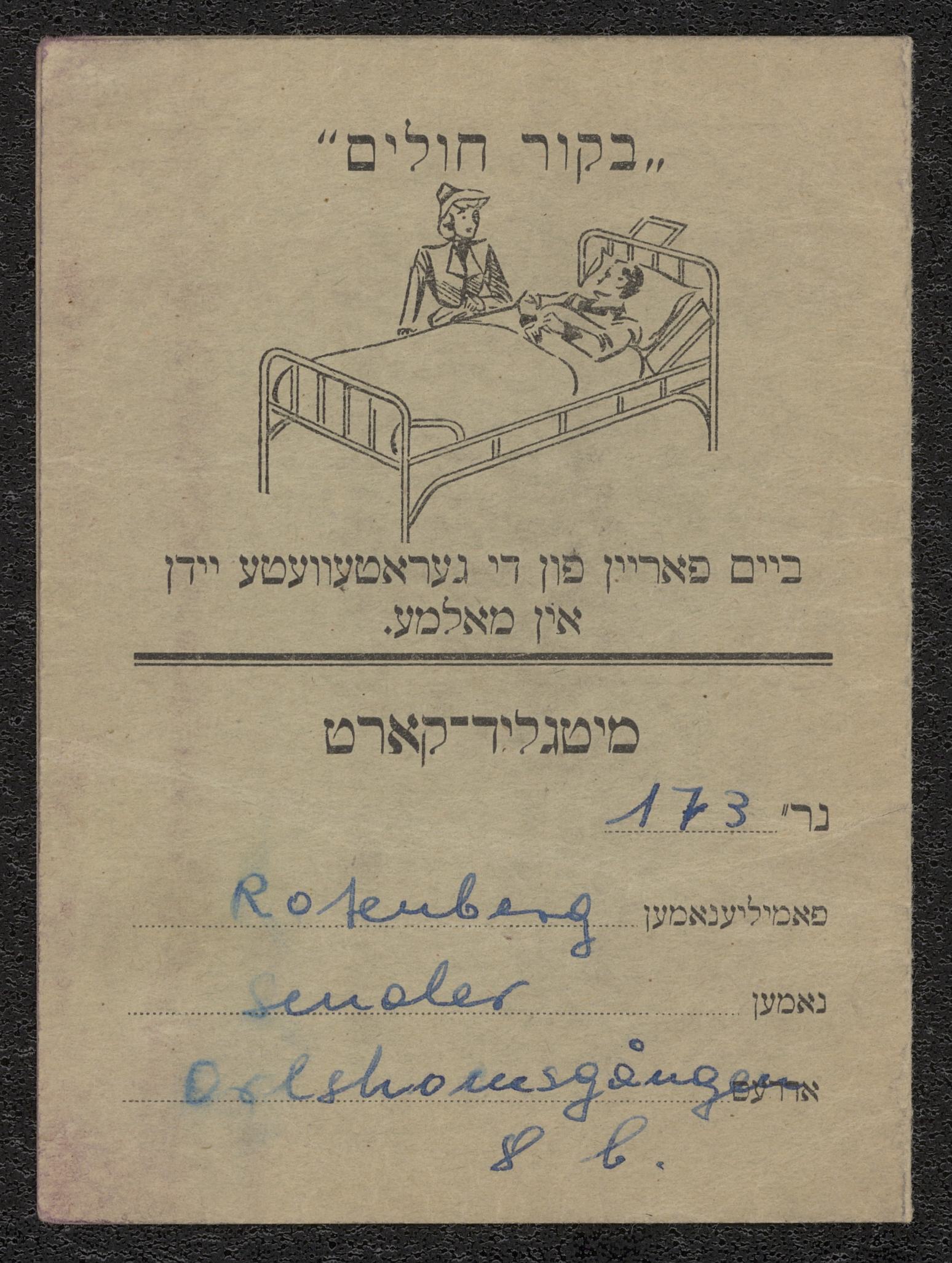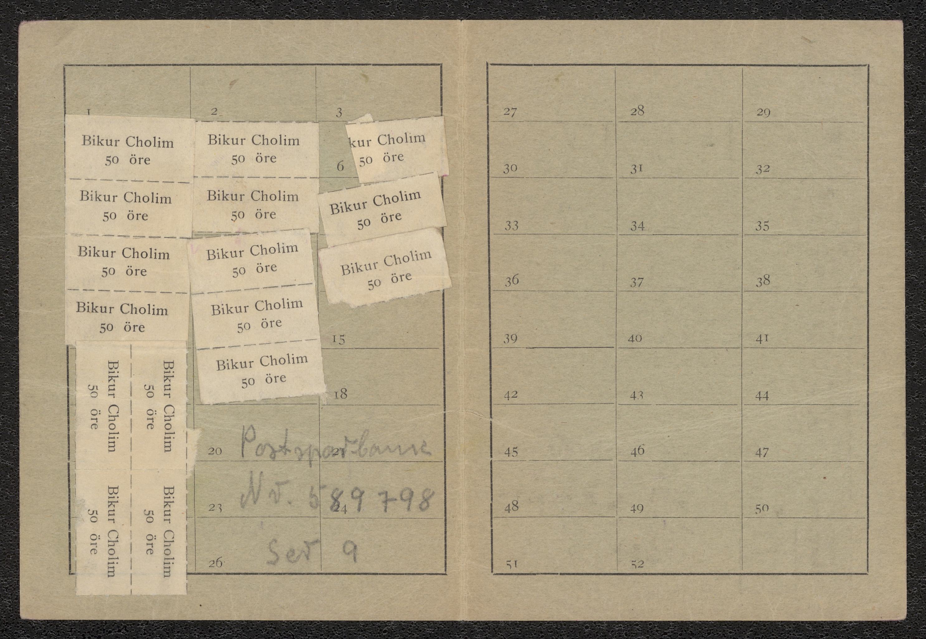 Grönt kort för medlemsskap i "bikur cholim" i Malmö, nummer 173. Inklistrade kuponger på insidan märkta 50 öre