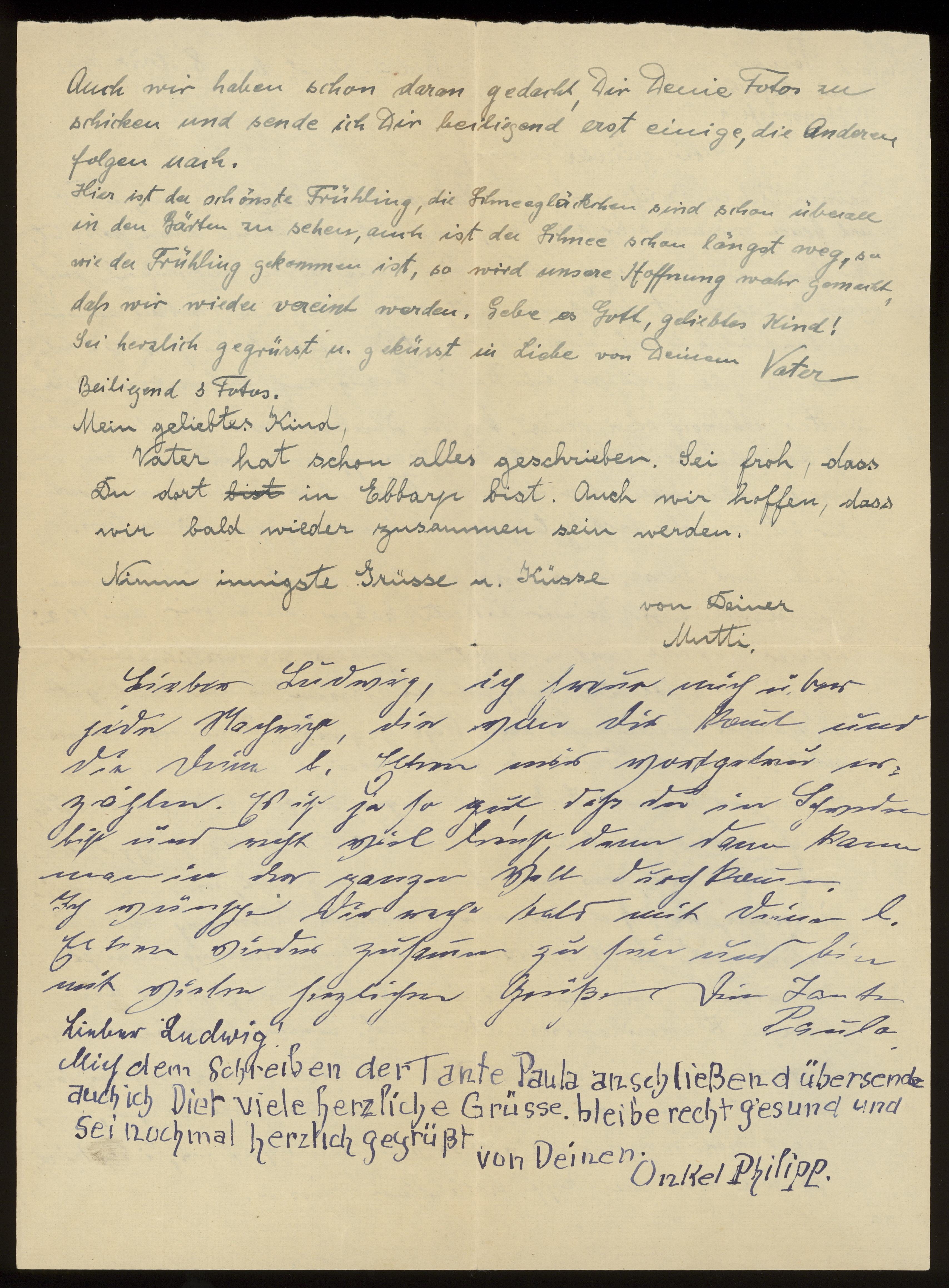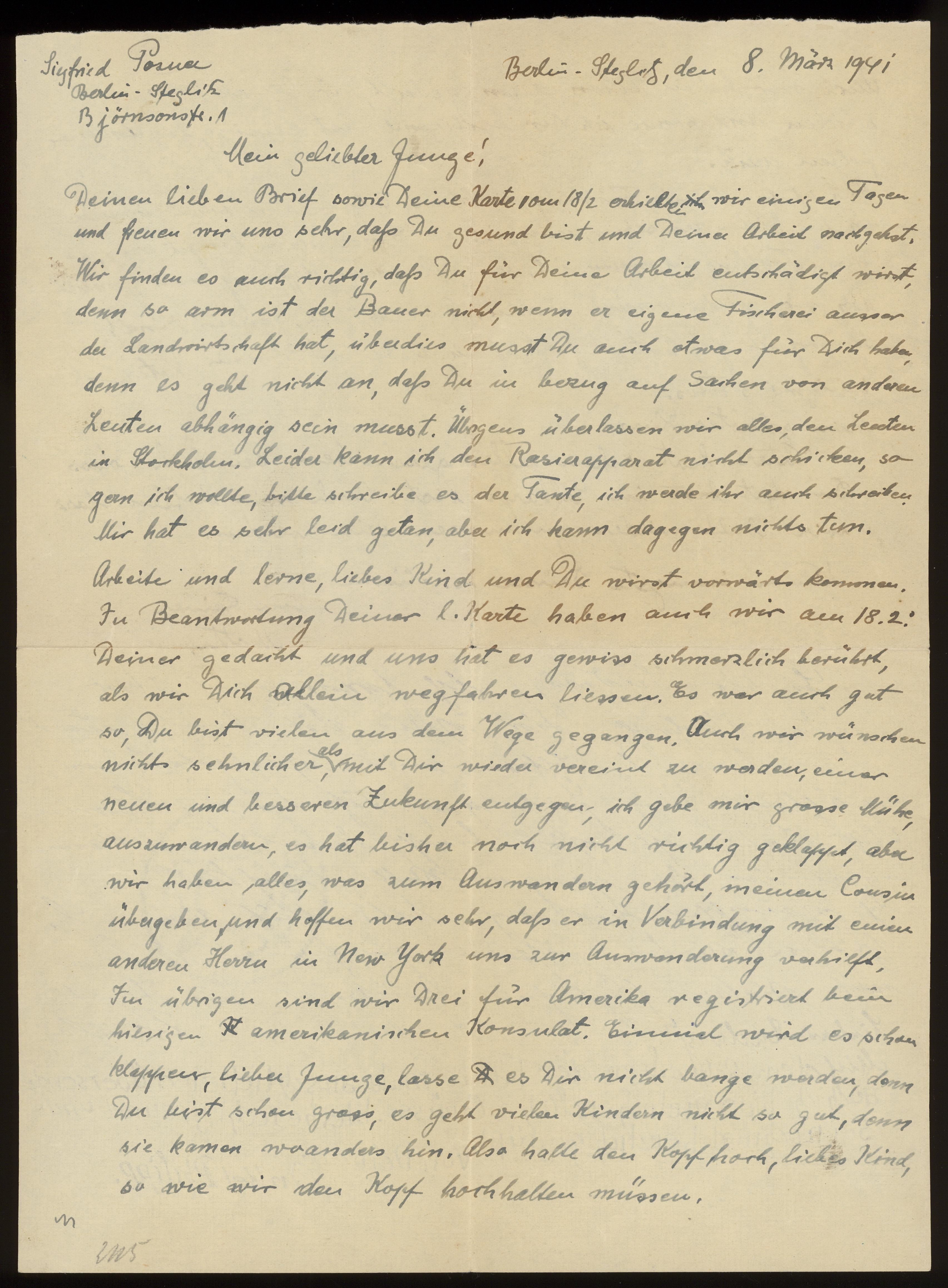 Brev från föräldrarna Anna och Siegfried Posner, Onkel Philipp Cohn och tante Paula till Ludwig Posner daterat 8 mars 1941.