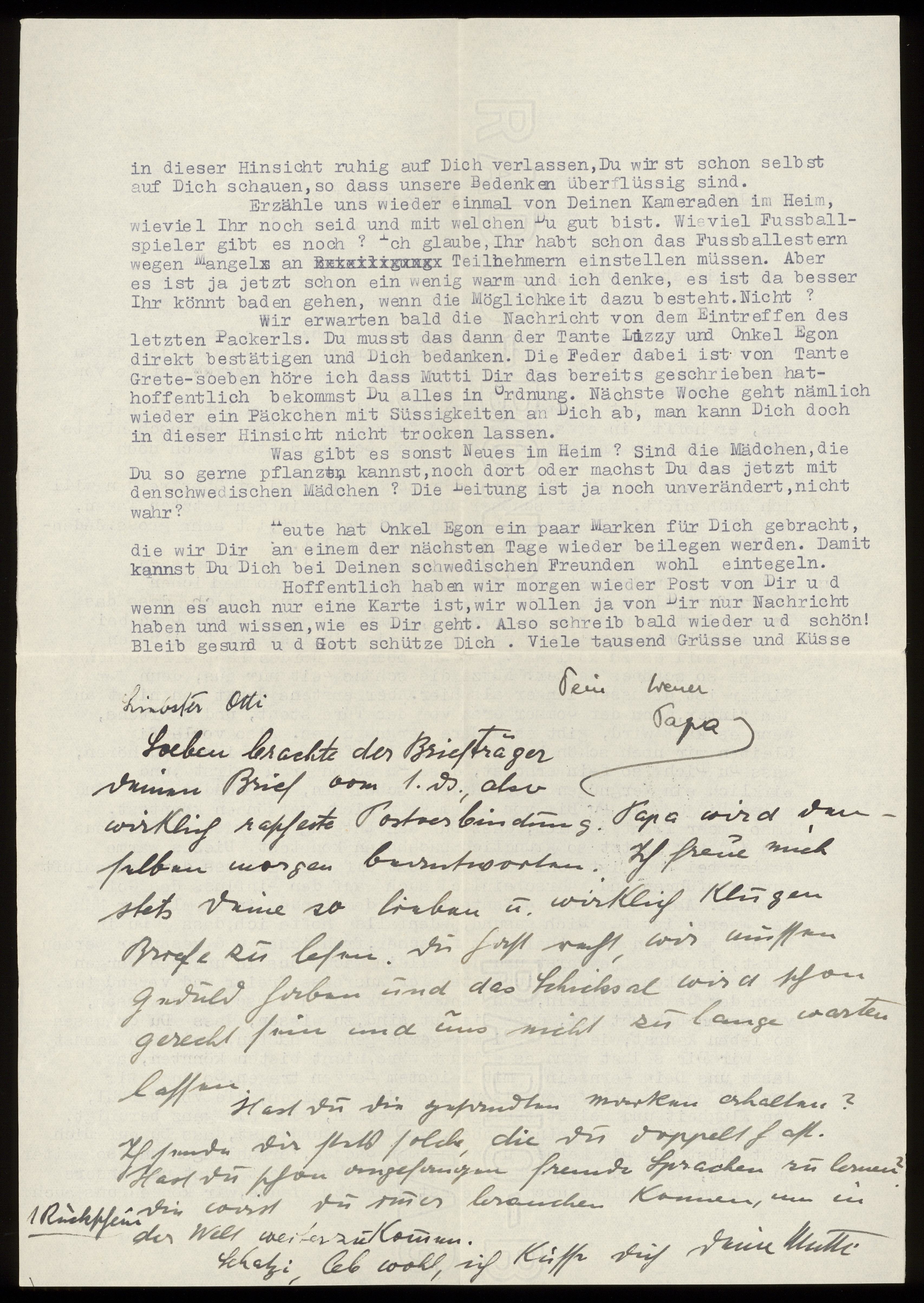 Maskinskrivet brev till Otto Ullman från föräldrarna Josef och Elise Ullmann daterat 2 juni 1939 Wien.