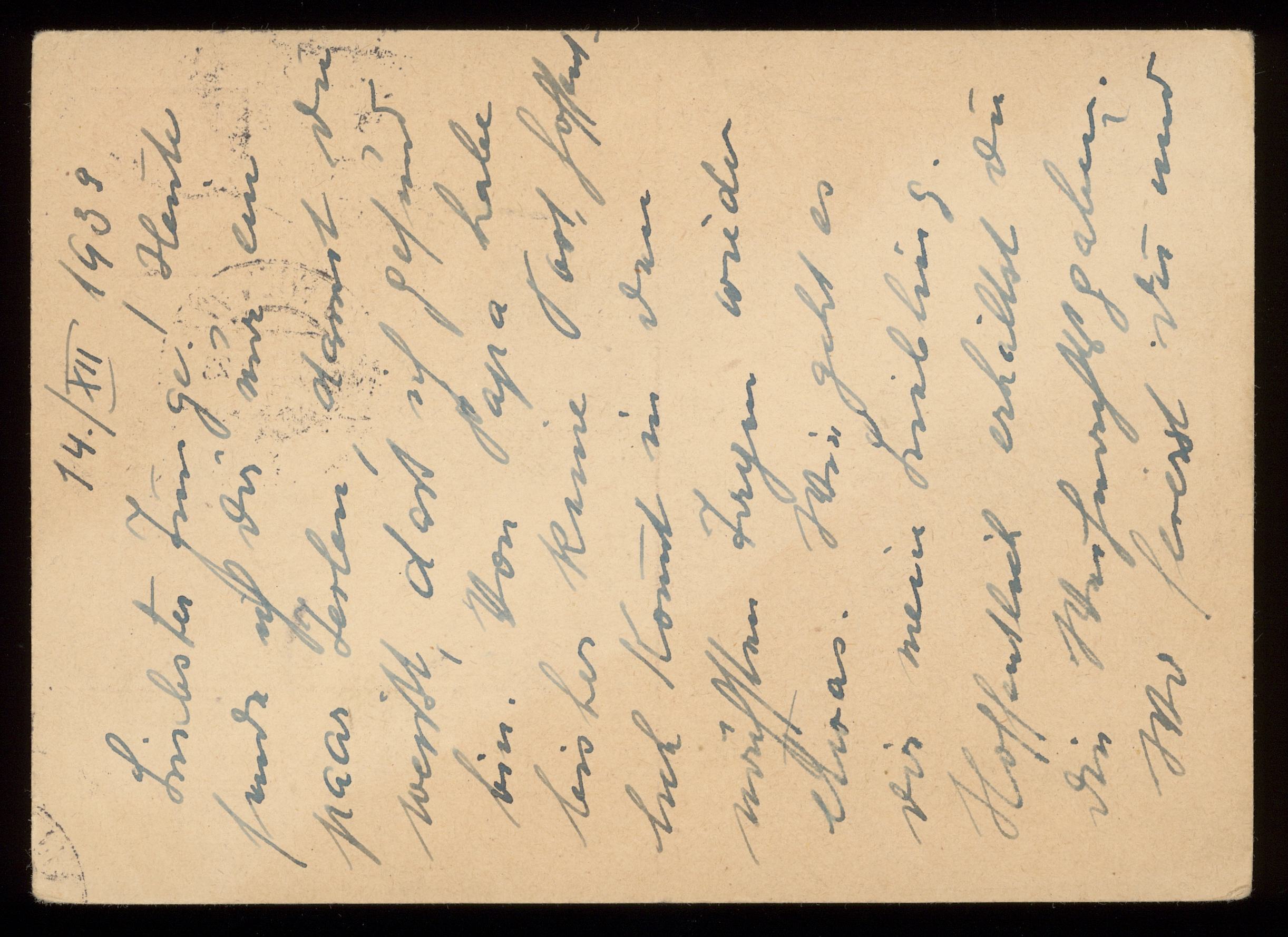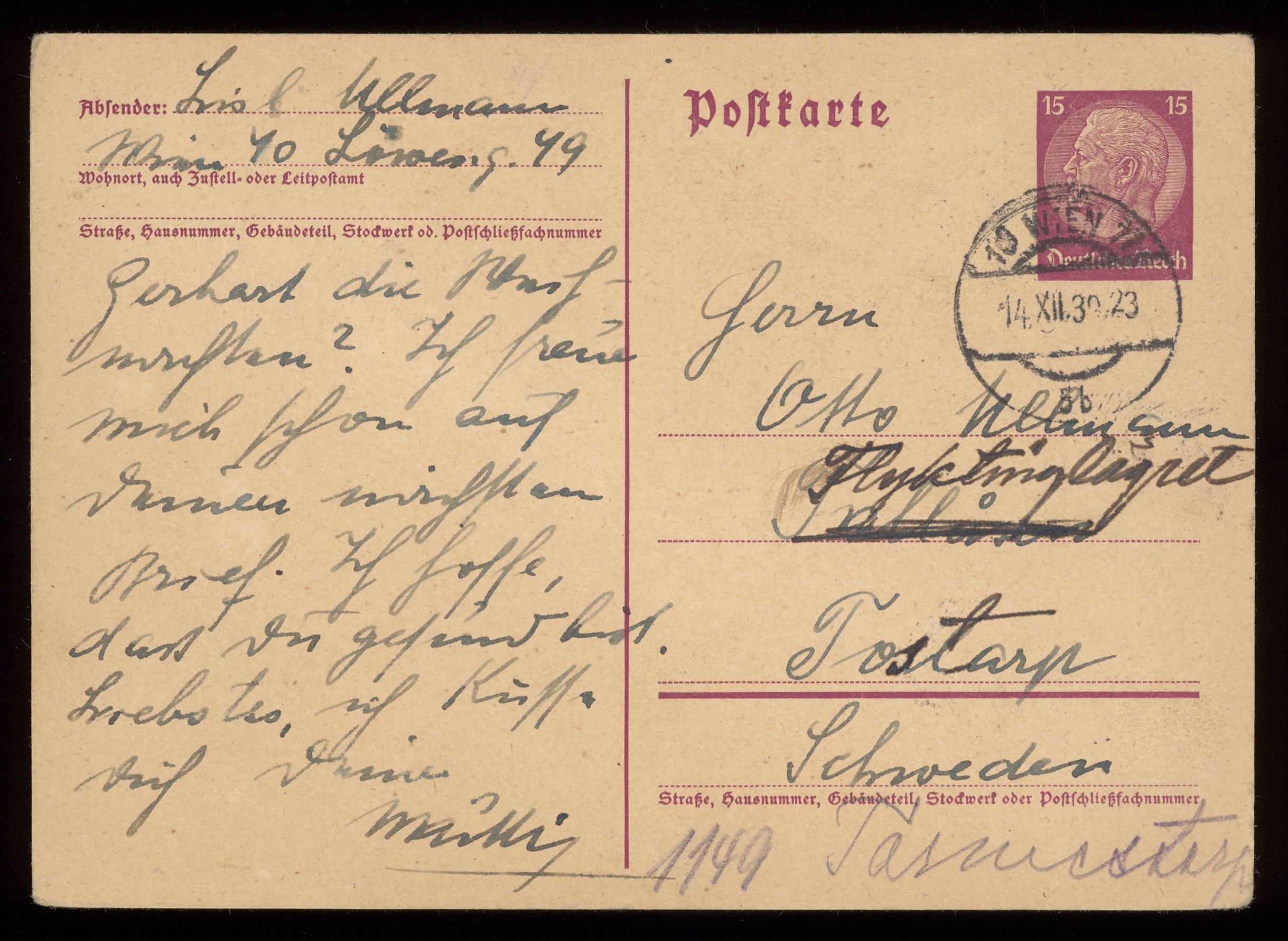 Brev till Otto Ullman från föräldrarna Josef och Elise Ullmann daterat 14 december 1939 Wien.