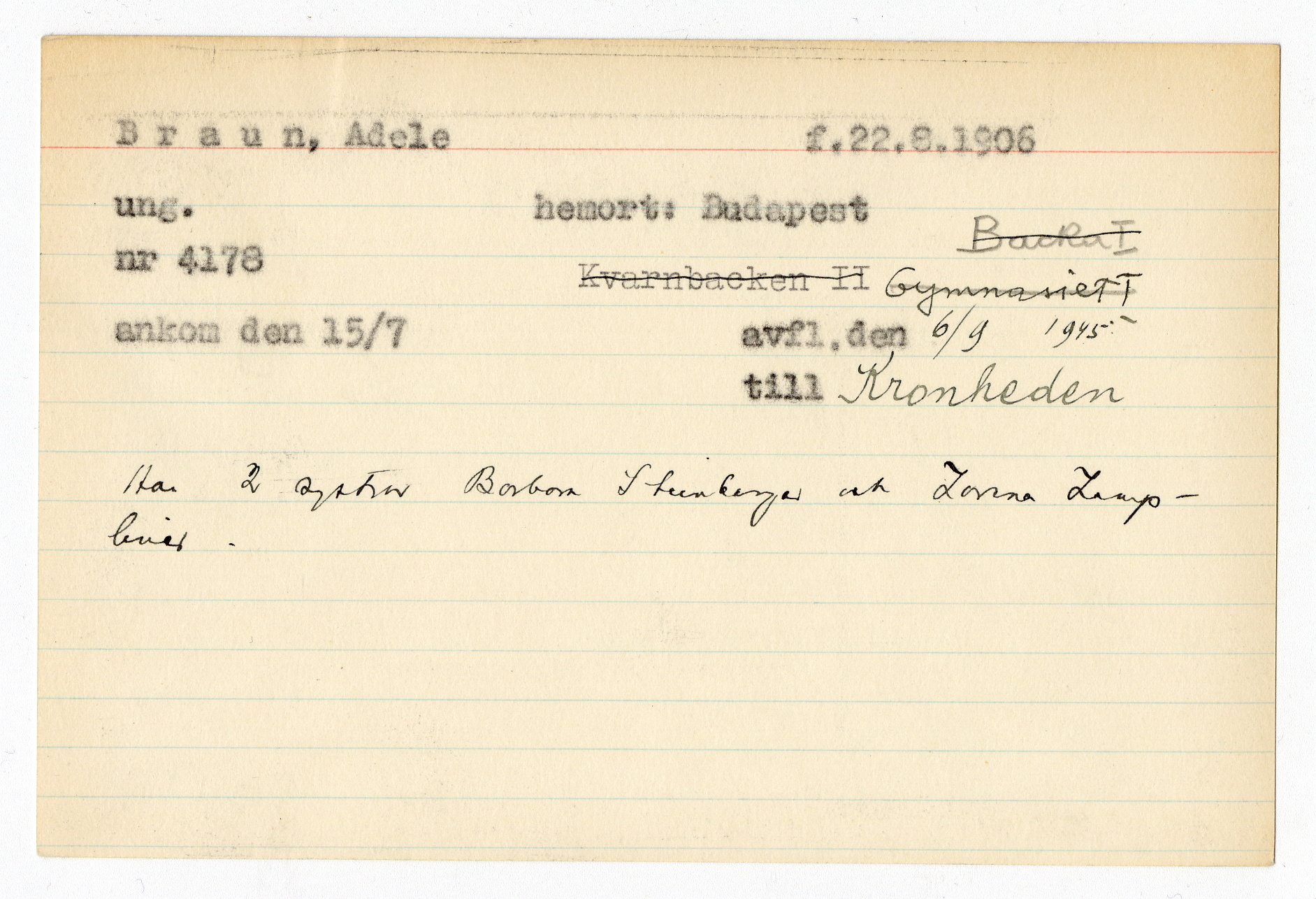 Ett skrivkort med patientuppgifter gällande Adele Braun.