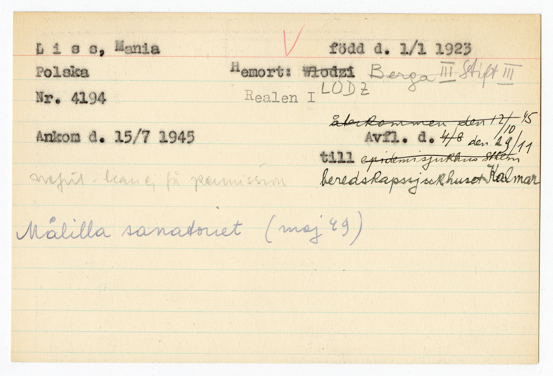 Ett skrivkort med patientuppgifter gällande Mania Liss.