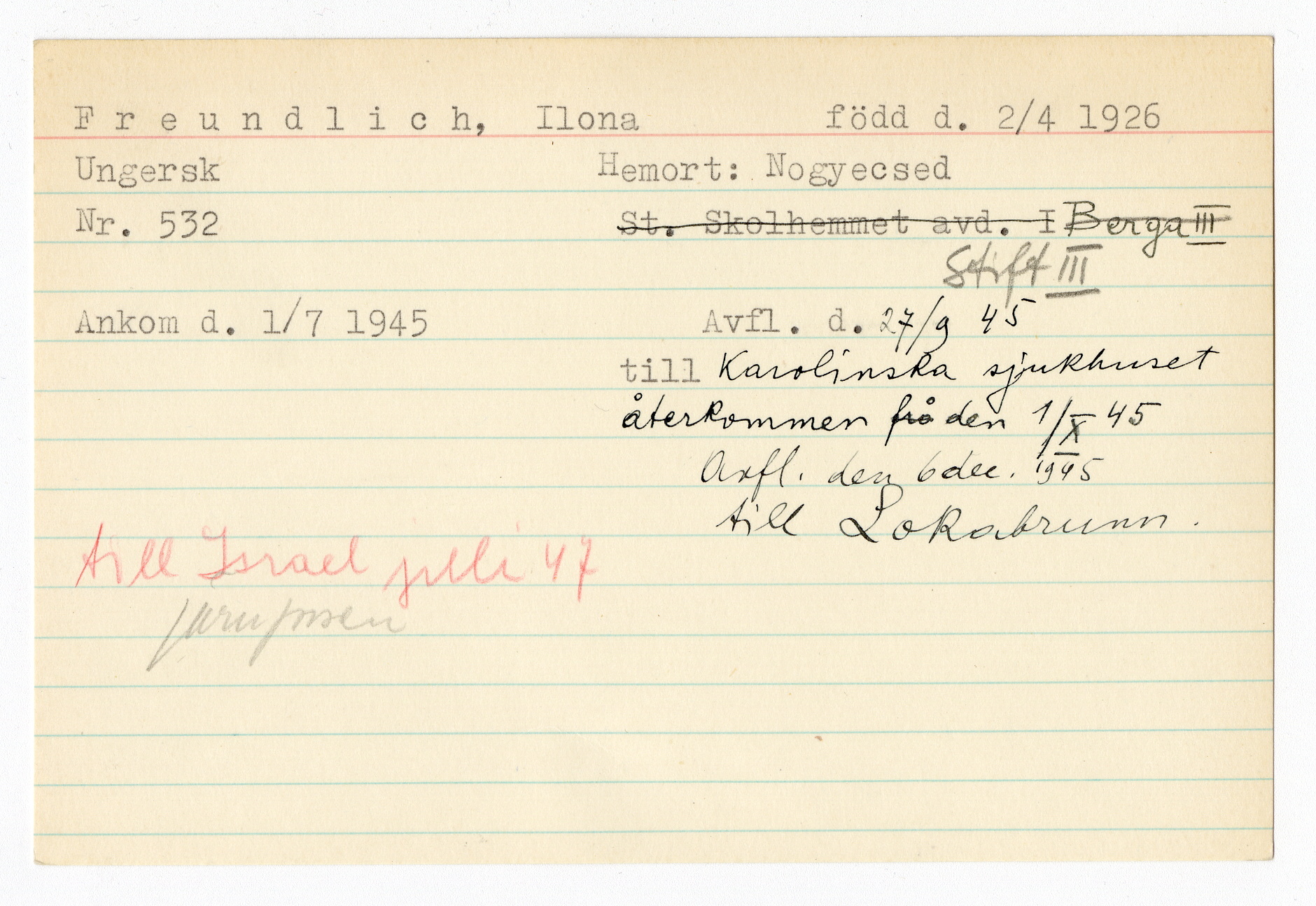Ett skrivkort med patientuppgifter gällande Ilona Freundlich.