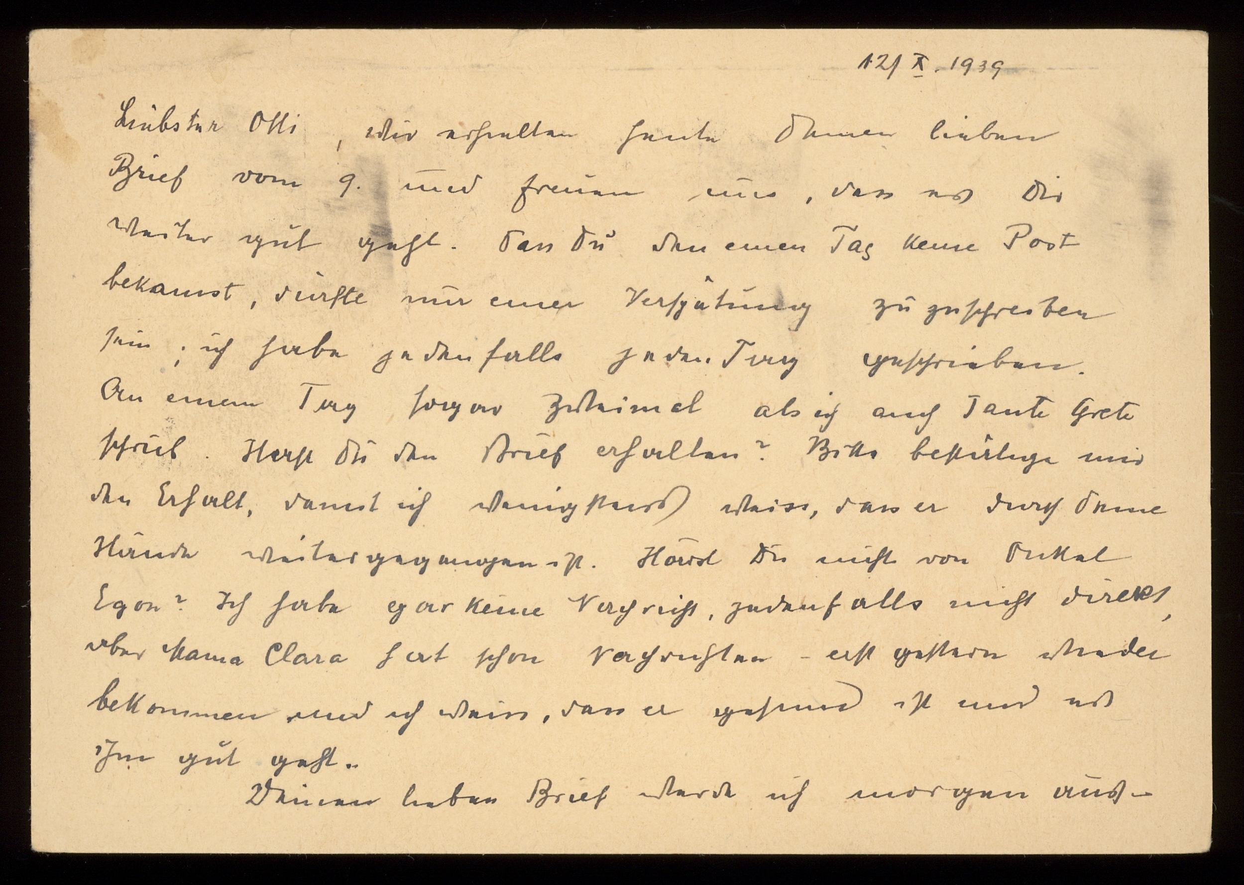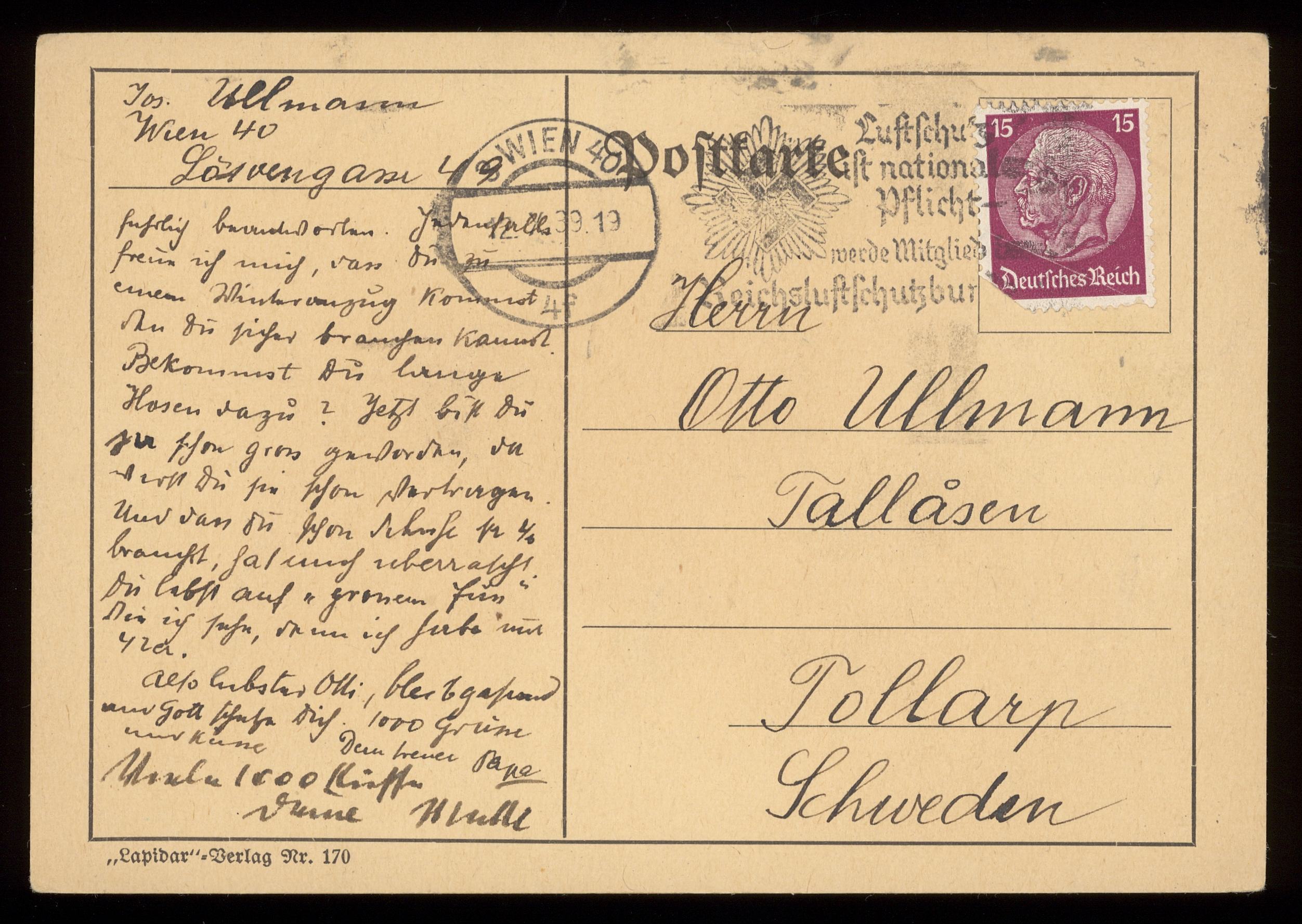 Brev till Otto Ullman från föräldrarna Josef och Elise Ullmann daterat 12 oktober 1939 Wien.
