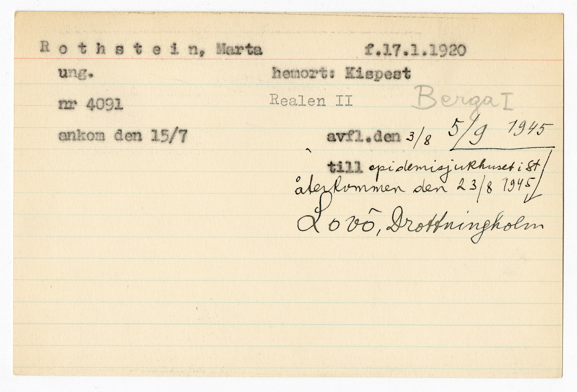 Ett skrivkort med patientuppgifter gällande Marta Rothstein.