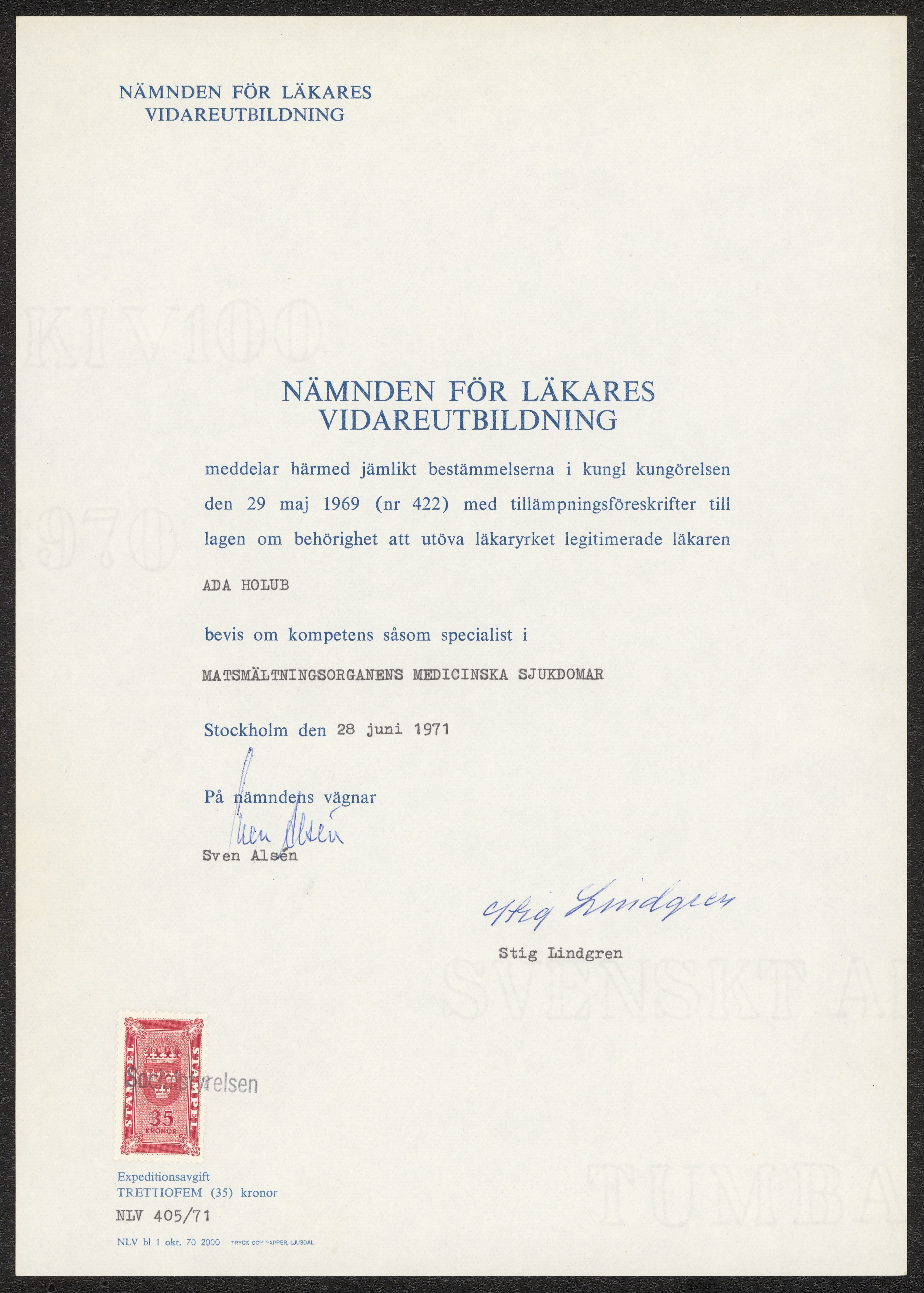 Bevis om specialistläkarkompetens för Ada Holub 1971, utfärdat av Nämnden för läkares vidareutbildning.