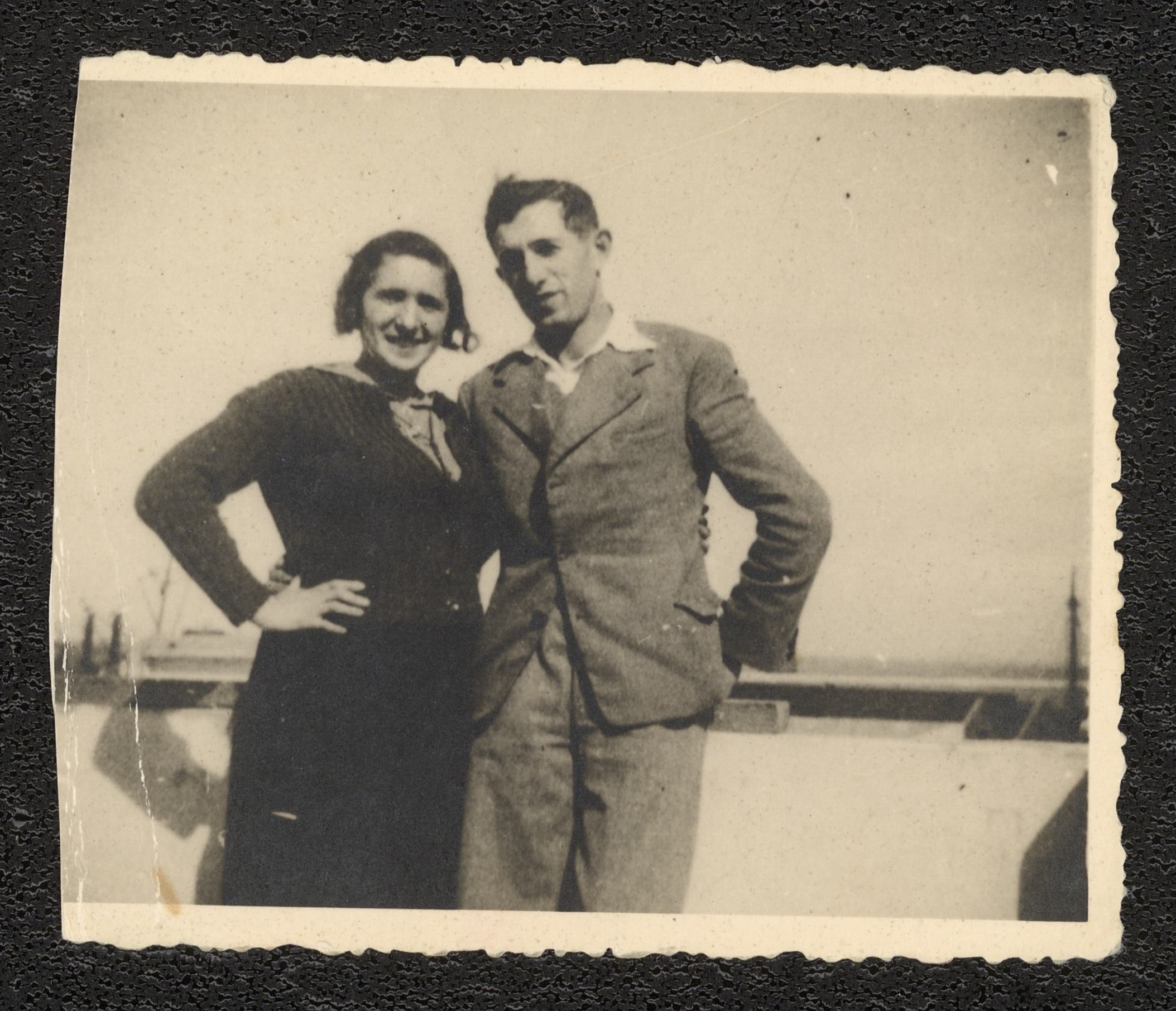 Svartvitt fotografi föreställande Rozia Zyskind tillsammans med brodern Shlomo Bogdanski. Bilden ska enligt uppgift vara tagen innan kriget.