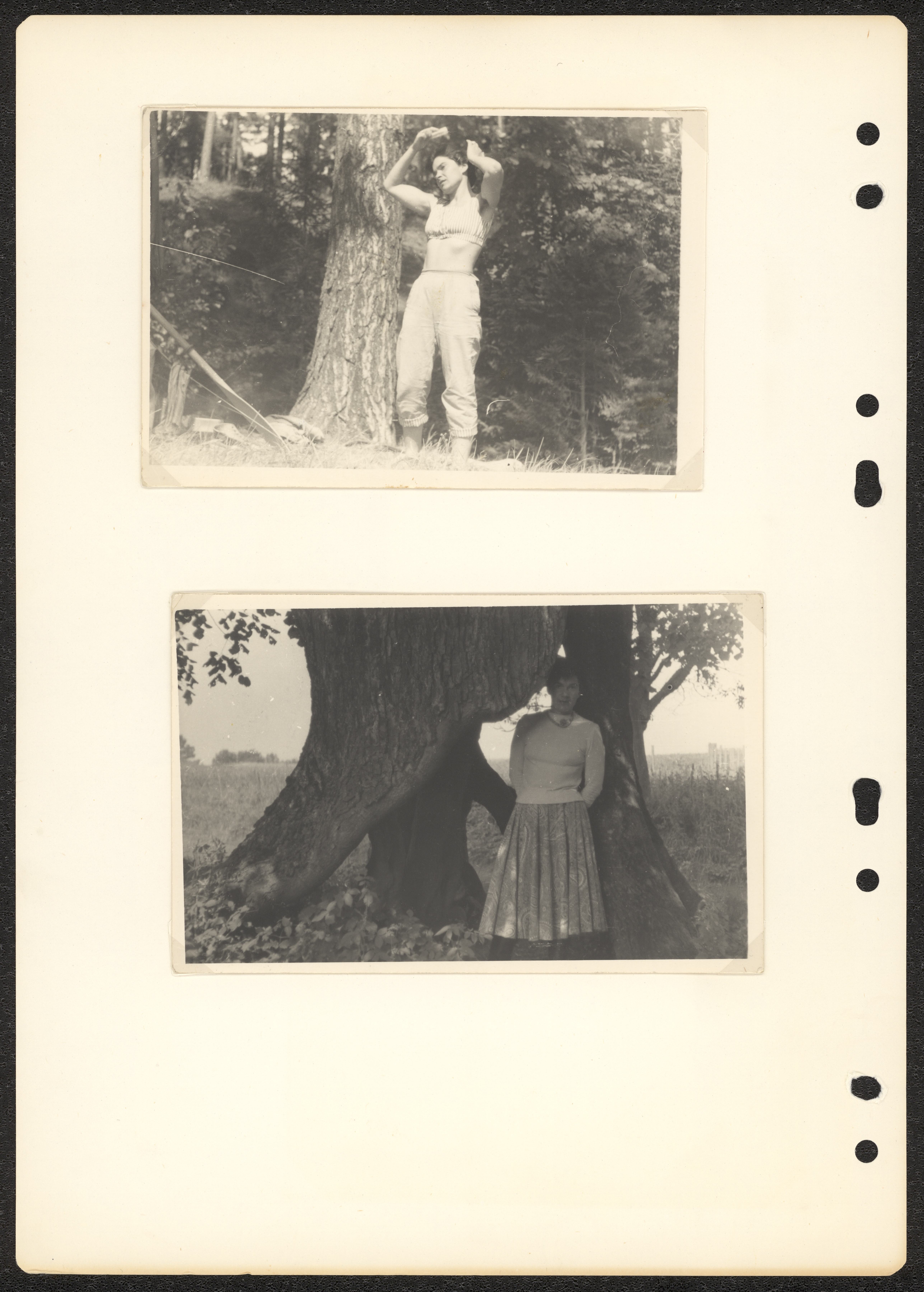 Albumsida från Ada Beckers fotopärm, med semesterbilder på Ada själv. Två bilder på framsidan, två på baksidan.