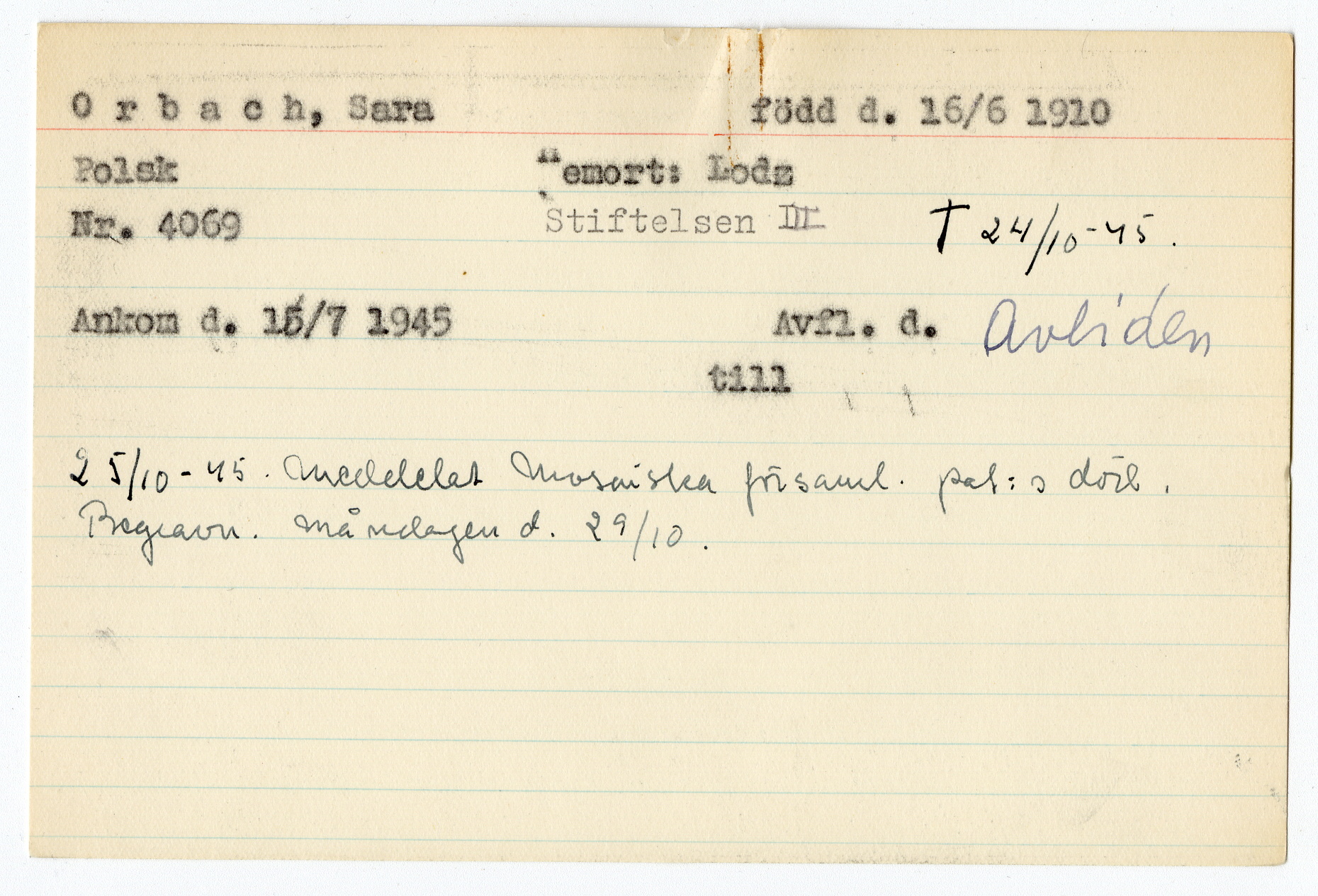 Ett skrivkort med patientuppgifter gällande Sara Orbach.
